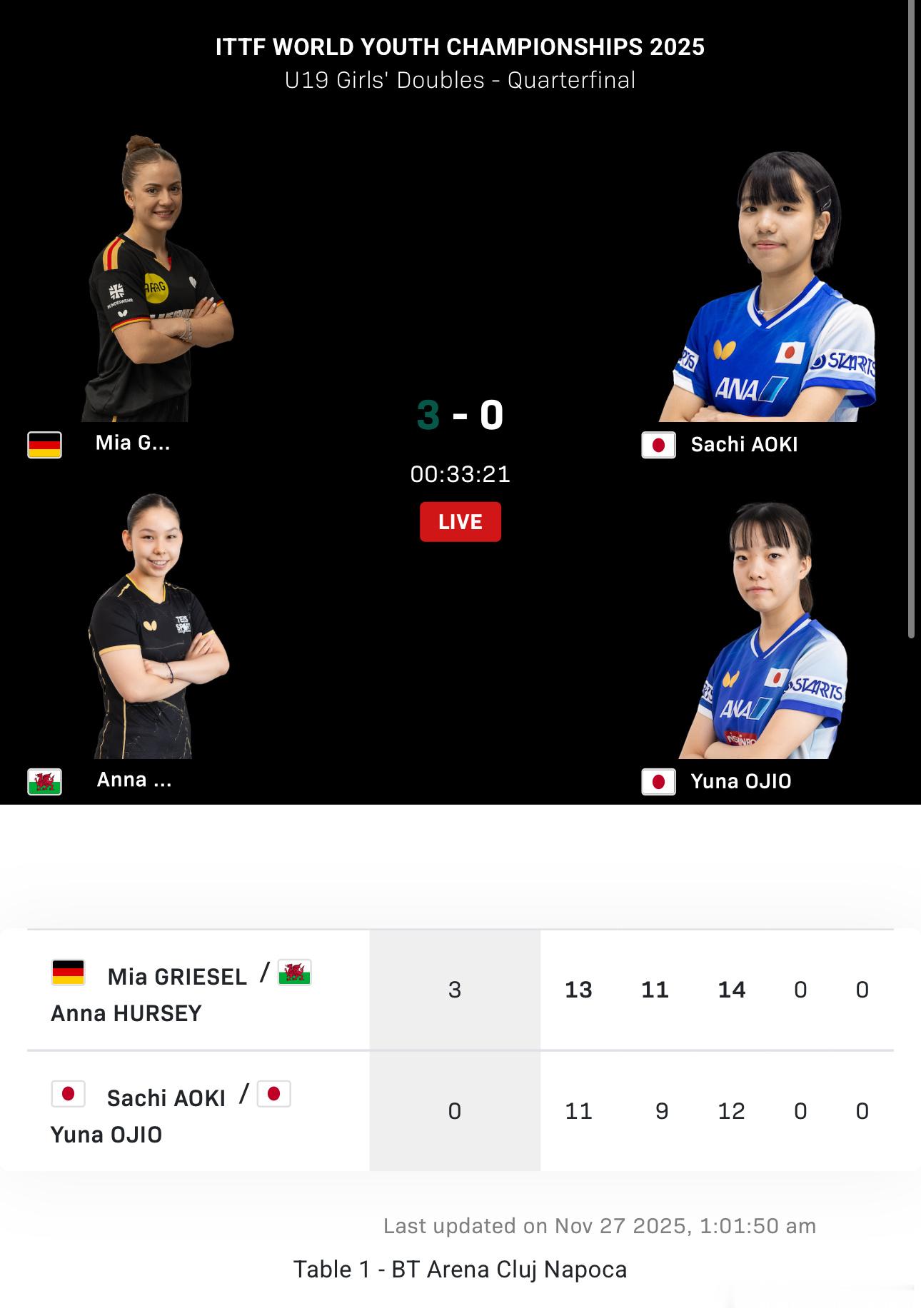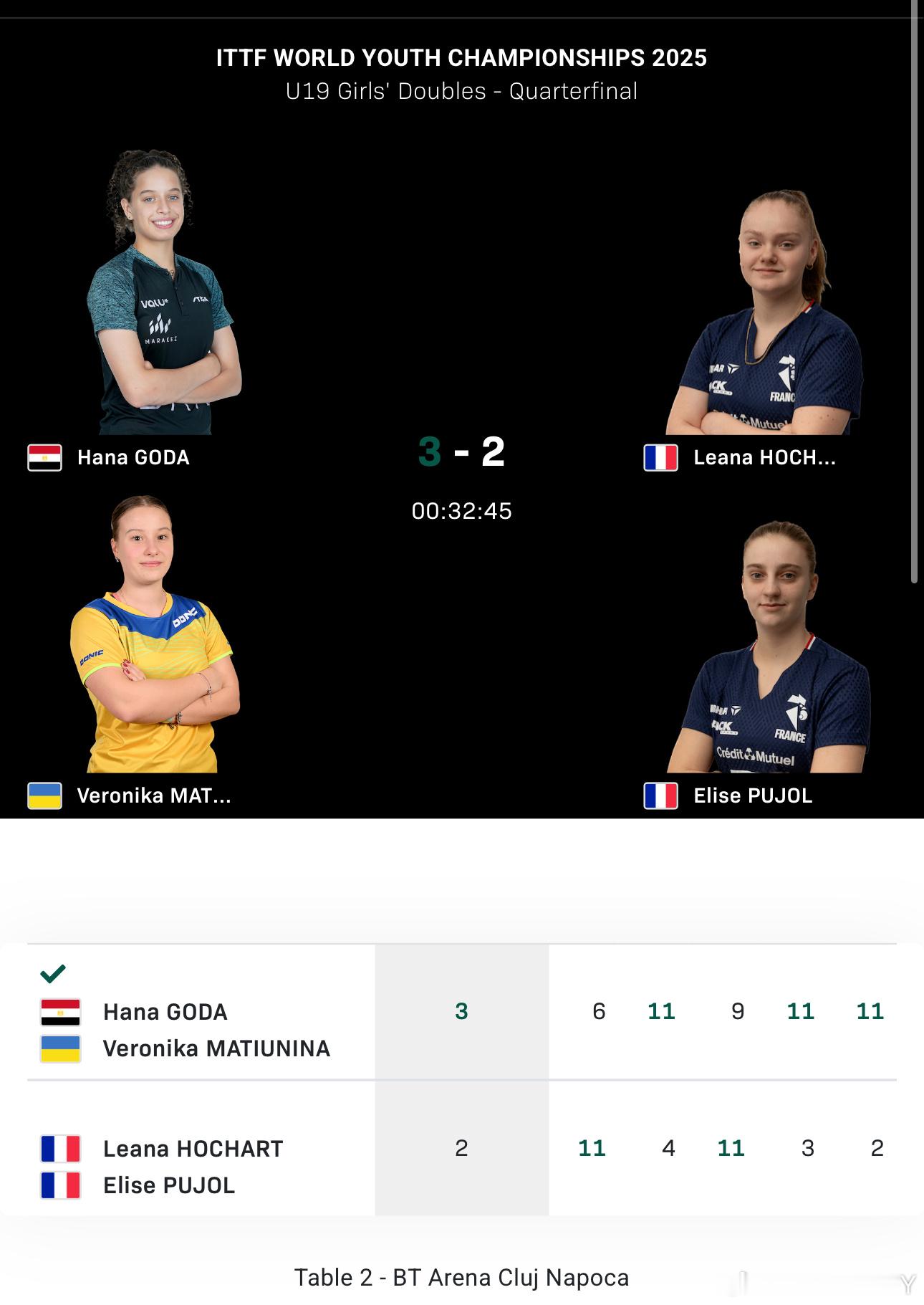 赫尔希/格里塞尔的跨国组合把日本女双掀翻了还是3-0零封另一组跨国女双高达/玛提乌尼亚也把法国女双赢了霍查特今天一日双输都是左右输了双右所以手虽然重要但是起决定性作用的是是球技和配合4-2纵歌曼/覃予萱VS叶伊恬/吴映珊赫尔希/格里塞尔VS高达/玛提乌尼亚