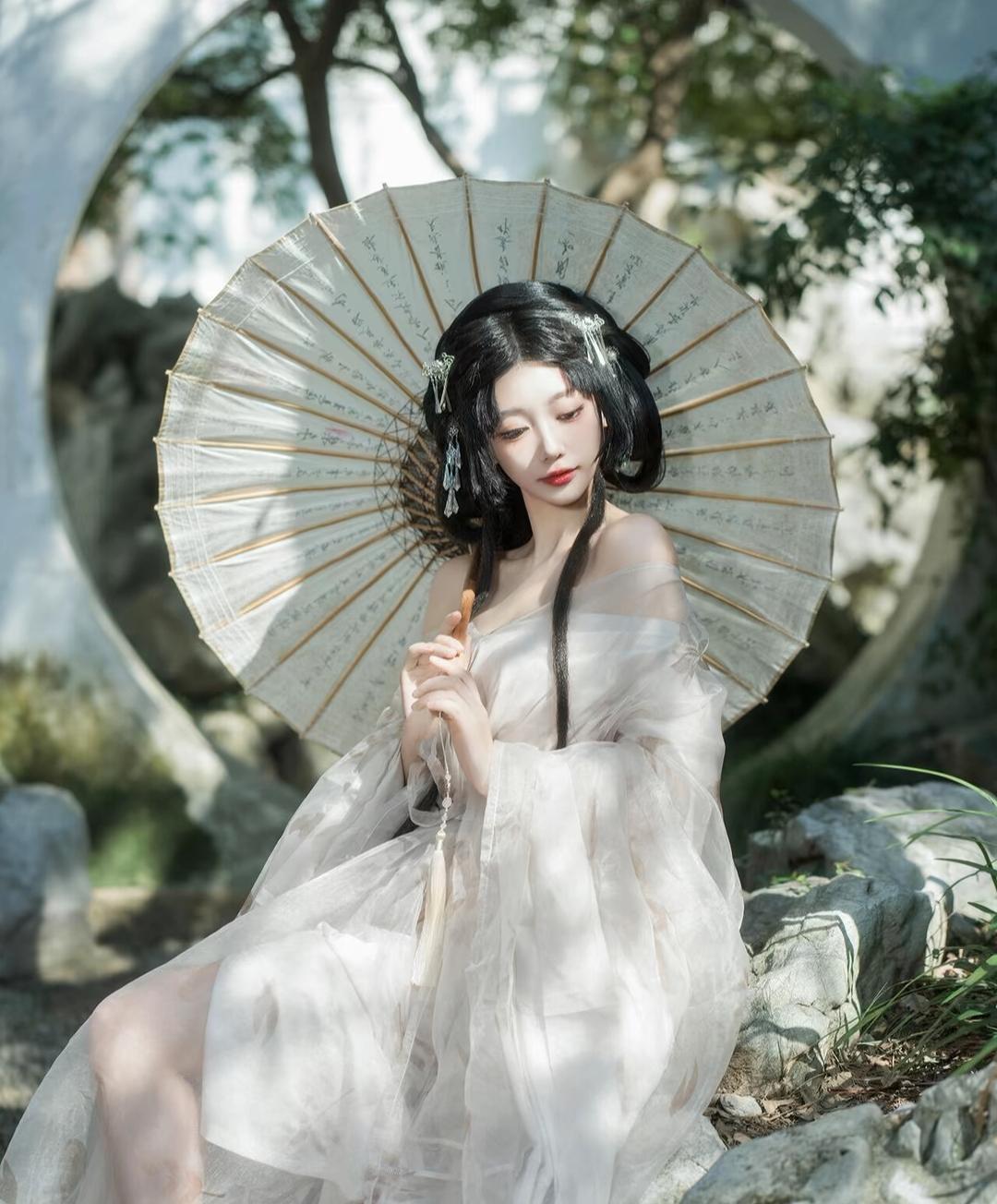 梦幻古风少女,樱花树下,轻纱飘逸,宛如仙子。