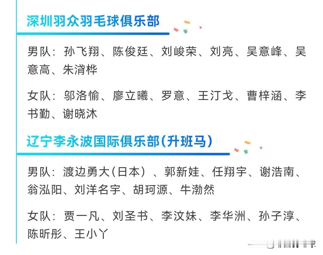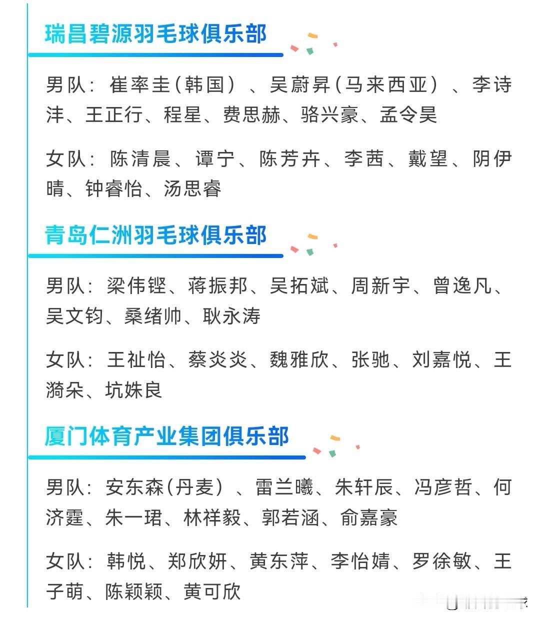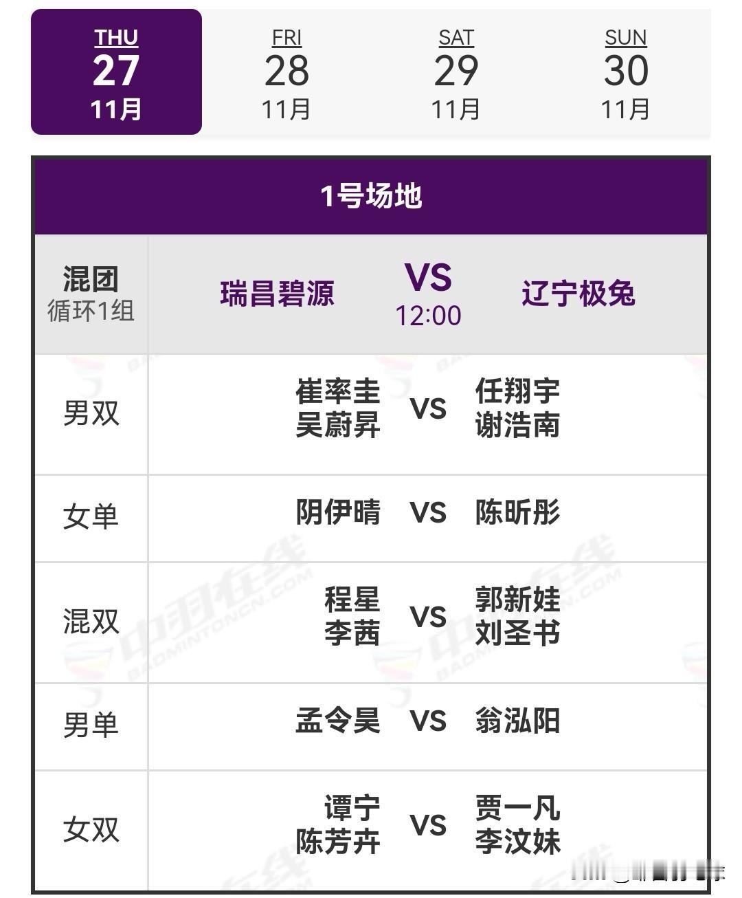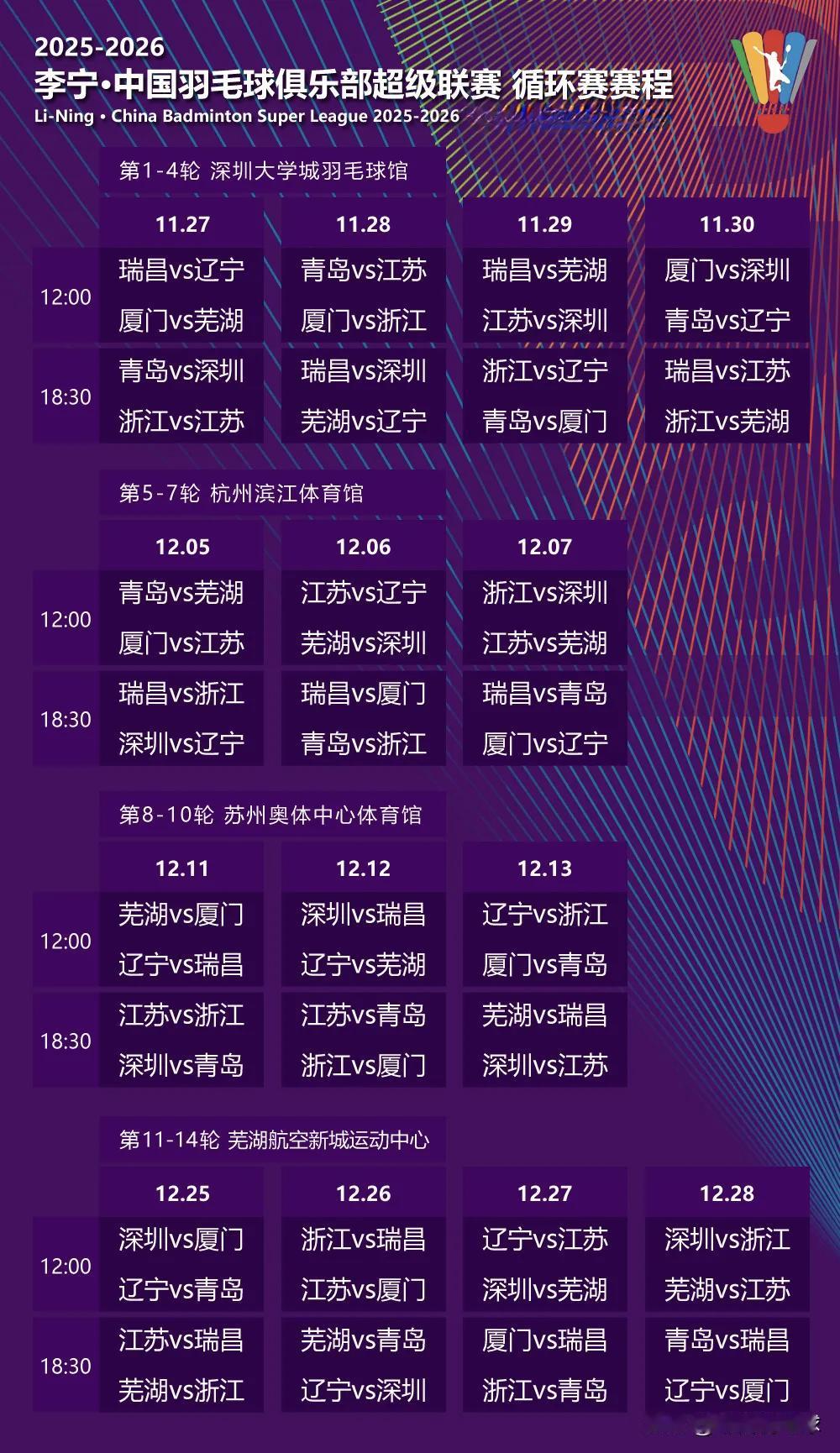 2025 - 2026中国羽毛球俱乐部超级联赛今日开幕 今日(11月27日),2025 - 2026中国羽毛球俱乐部超级联赛正式打响。比赛在广东深圳大学城羽毛球馆举行,上午场12:00开赛,晚场18:30开赛,共有两块场地同时进行。上午场的详细对阵名单如下,晚场对阵名单官方尚未公布,待公布后会及时更新,请持续关注。 后附循环赛赛程表和各俱乐部球员名单。 羽毛球 羽毛球爱好者 羽毛球比赛 羽毛球赛事 羽毛球赛程 国羽 国羽加油 2025-2026中国羽毛球俱乐部超级联赛 国家羽毛球赛