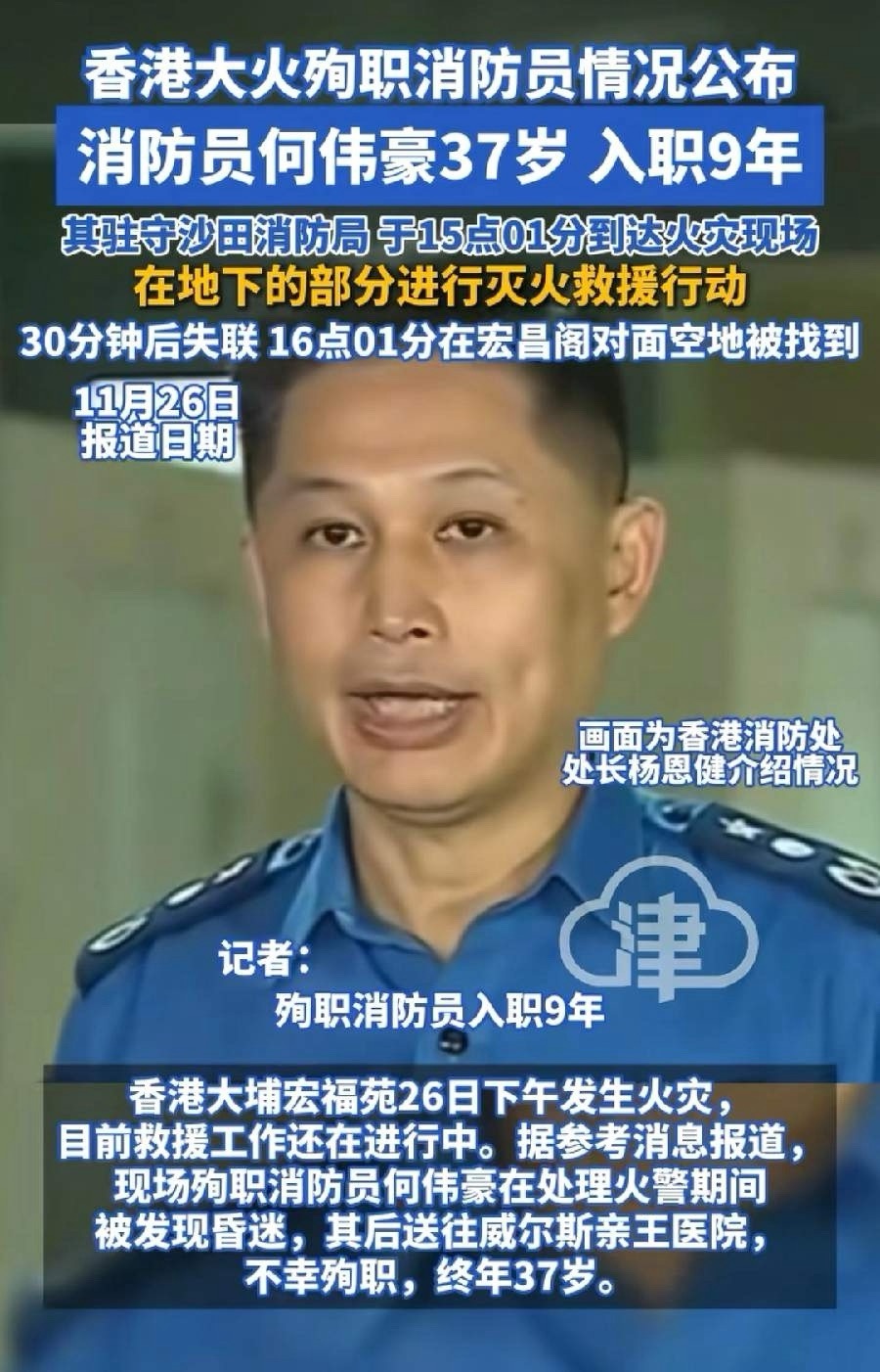 何伟豪!香港火灾牺牲消防员,向他致敬!37岁,沙田消防局入职9年,处置火警时昏迷,送医不治去世!是本次香港特大火灾,最早遇难者之一,更添悲情一笔,消防员这份职业,在香港备受尊敬,历来牺牲人员都会受到很高礼遇,这一次肯定会更加隆重,目前香港消防处官网已经变成黑白,希望火势尽快扑灭,这也是对何伟豪的一种告慰!