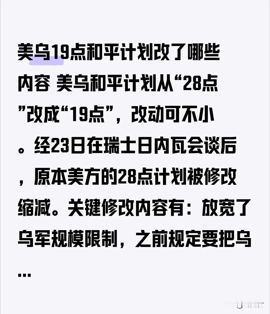 美乌19点和平计划改了哪些内容 美乌19点和平计划改动了哪些内容?美乌和平计划从“28点”缩减为“19点”,改动颇大。23日在瑞士日内瓦会谈后,美方原本的28点计划被修改缩减。关键修改内容包括:放宽乌军规模限制,此前规定乌军需控制在60万人以内;不再包含特赦俄乌冲突中“战争罪行”相关内容;领土划分、乌加入欧盟和北约及对乌安全保障等议题被搁置。 之前的28点协议倾向俄方,遭到乌方和欧洲国家反对,新版更贴合乌方立场,俄方估计难以接受。当前俄乌战局僵持,四方博弈仍会持续,未来走向充满不确定性。