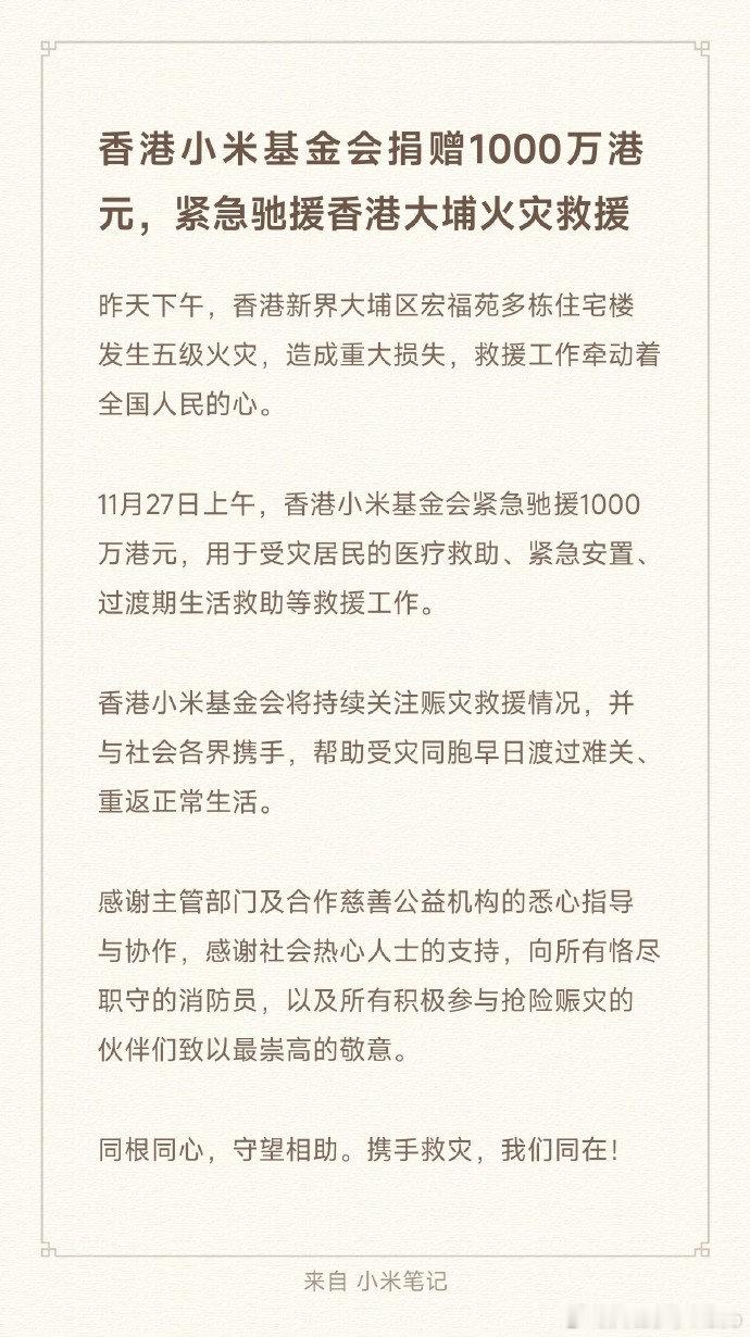 【香港小米基金会捐赠1000万港元】小米捐款驰援香港大埔火灾救援 11月27日,宣布:香港小米基金会捐赠1000万港元,紧急驰援香港大埔火灾救援。祈愿逝者安息、伤者康复,受灾同胞早日渡过难关 香港小米基金会捐赠1000万港元,紧急驰援香港大埔火灾救援。祈愿逝者安息、伤者康复,受灾同胞早日渡过难关 香港火灾已致44人遇难