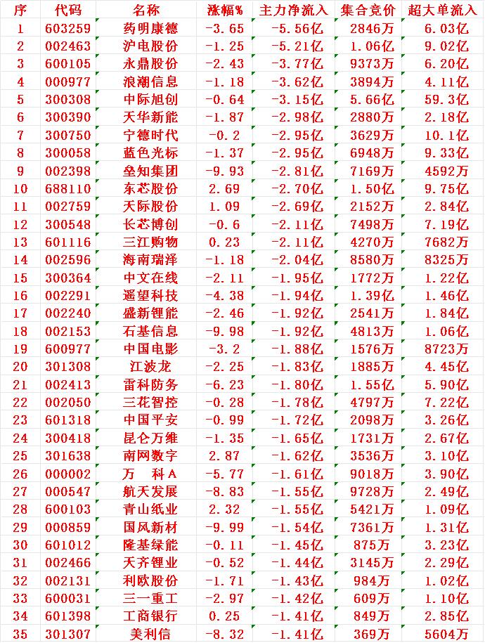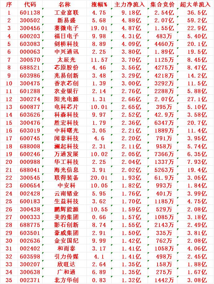 11月27日上午盘,主力趁低位,大幅买入的35名单: 工业富联:涨幅 +4.75%,净流入 9.18亿元 新易盛:涨幅 +5.68%,净流入 4.88亿元 赛微电子:涨幅 +19.01%(涨停或接近涨停),净流入 4.87亿元 福日电子:涨幅 +9.98%(涨停),净流入 4.31亿元 剑桥科技:涨幅 +8.89%,净流入 4.09亿元 11月27日中午收盘,主力资金“大幅卖出”的35名单: 药明康德:涨幅 -3.65%,净流入 -5.56亿元 沪电股份:涨幅 -1.25%,净流入 -5.21亿元 永鼎股份:涨幅 -2.43%,净流入 -3.77亿元 浪潮信息:涨幅 -1.18%,净流入 -3.62亿元 中际旭创:涨幅 -0.64%,净流入 -3.15亿元