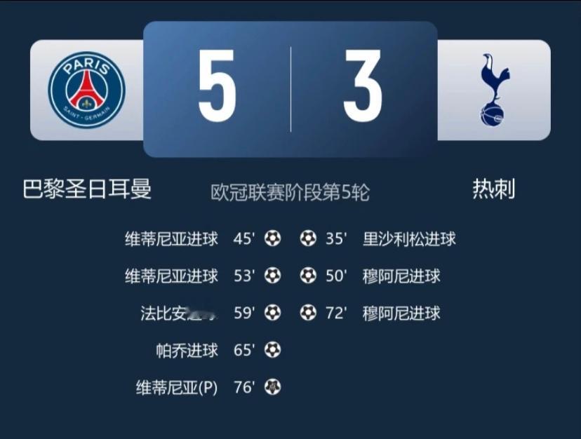 巴黎圣日耳曼逆转取胜在刚刚结束的欧冠对决中,巴黎圣日耳曼主场上演了一场精彩的逆转,以5-3战胜热刺。巴黎圣日耳曼5比3热刺本场比赛最突出的,是上演帽子戏法的维蒂尼亚,他在上半场补时阶段用一记精彩远射为球队扳平比赛,在下半场热刺领先后不久,他再次挺身而出梅开二度。比赛尾声阶段,他创造点球并稳稳罚进,为球队锁定胜局。球队的逆转也离不开中场的有效组织,法比安·鲁伊斯攻入一球,若昂·内瓦斯的灵巧脚后跟助攻恰到好处,中卫帕乔不仅在防守端表现稳健,还抓住角球机会在混战中破门,在攻防两端都做出了关键贡献。全队用高效的进攻将机会转化为进球,拿下了这场胜利,同时巴黎圣日耳曼在欧冠积分榜升至第二位,向淘汰赛迈出了坚实的一步