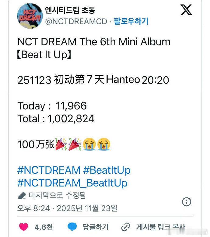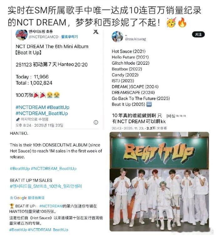 kpop连续10张专辑突破百万销量的男团 NCT是真的稳!新专《Beat It Up》首周销量轻松破百万,顺利拿下连续十张百万专辑的成就~不仅多国榜单登顶,音源也一路横扫,地租的实力和口碑果然没让人失望!