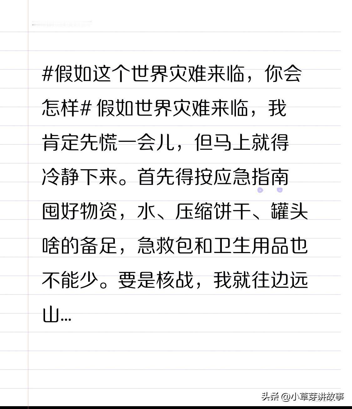 若世界灾难降临,我会先慌乱片刻,随后迅速冷静。按应急指南囤好物资,水、压缩饼干、罐头等备齐,急救包和卫生用品也不可或缺。 核战爆发,就前往边远山区或像重庆近120米深地铁站躲避;地震时,使用逃生绳与护目镜;洪涝则靠漂浮救生绳和防水挡板保命。 家人安全首位,带他们一同躲避。确保自身安全后,能帮则帮。不过届时情况难料,只能随机应变。