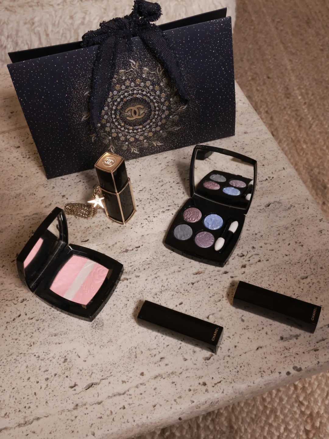 昨晚大风把温度刮没了,揣着热可可冲去见闺蜜 每年节日互换礼物是我们的仪式感 今年她送的香奈儿限定彩妆系列,一打开像跌进星空🌃 浮雕上的幸运符号也太戳了! 用这套画了个“幻彩星愿妆” 四色眼影397 蓝紫色调仿佛冬夜银河 高光腮红盘997 清透粉嫩提升气色 丝绒唇膏58 红木色百搭显白 最后喷上5号香水,抽象调花香萦绕随行 珠宝般的链条上还有幸运符号5与彗星 不仅方便携带更是时髦配饰 好啦,今天就带着这份幸运,和她美美约会去啦!