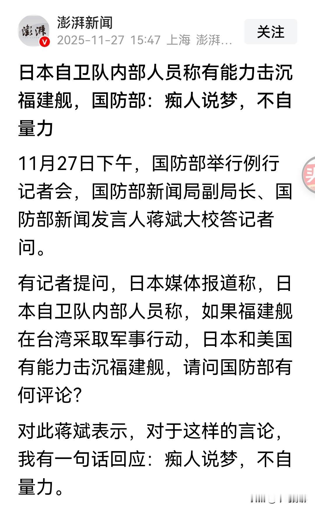日本自卫队称有能力击沉福建舰,这已经是赤裸裸的威胁和挑衅了,是时候放弃不首先使用