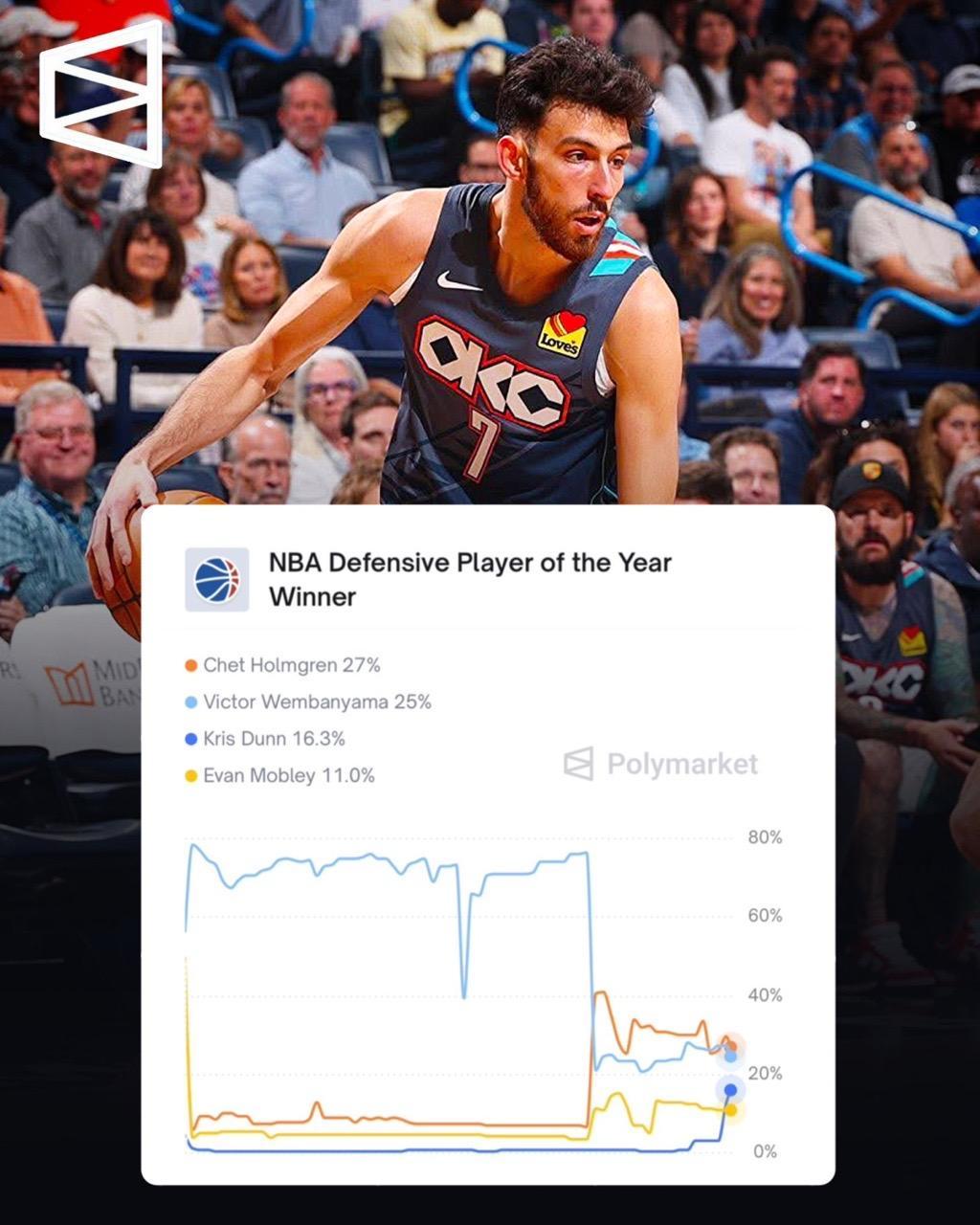 NBA那点事切特-霍姆格伦在Polymarket平台上已超越维克托-文班亚马,成为年度最佳防守球员奖项的最热门人选。截止目前,霍姆格伦场均获得18.3分7.9篮板1.8助攻0.7抢断1.5盖帽,防守效率98.9,高居联盟第4。