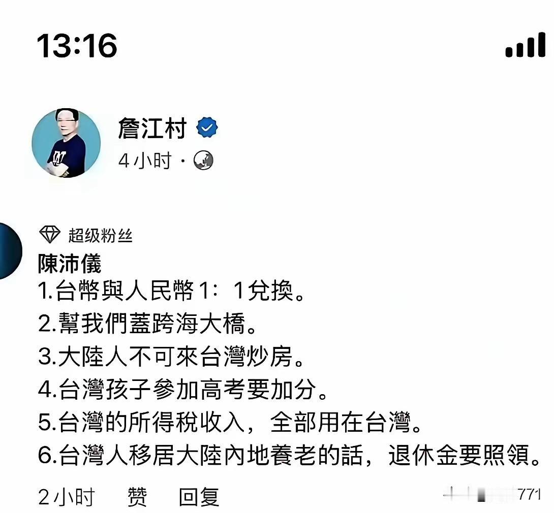 这位台湾同胞就像一个自恃清高的江西美女,不光要88万彩礼,还要改口费,上轿费,下车费,五金,还不给男人生孩子,只有一味索取,没有双向奔赴,真的是把自己凌驾于普通中国人的地位之上了。 大桥我们是要造的,不是方便台湾人,也是方便全体中国人;至于炒房,我想大多数国人没这个想法,一来台湾房价不低,都是私有化,破破烂烂的城市,城建也不怎么样,二来台湾地震台风频发,房子可能一不小心就没了。