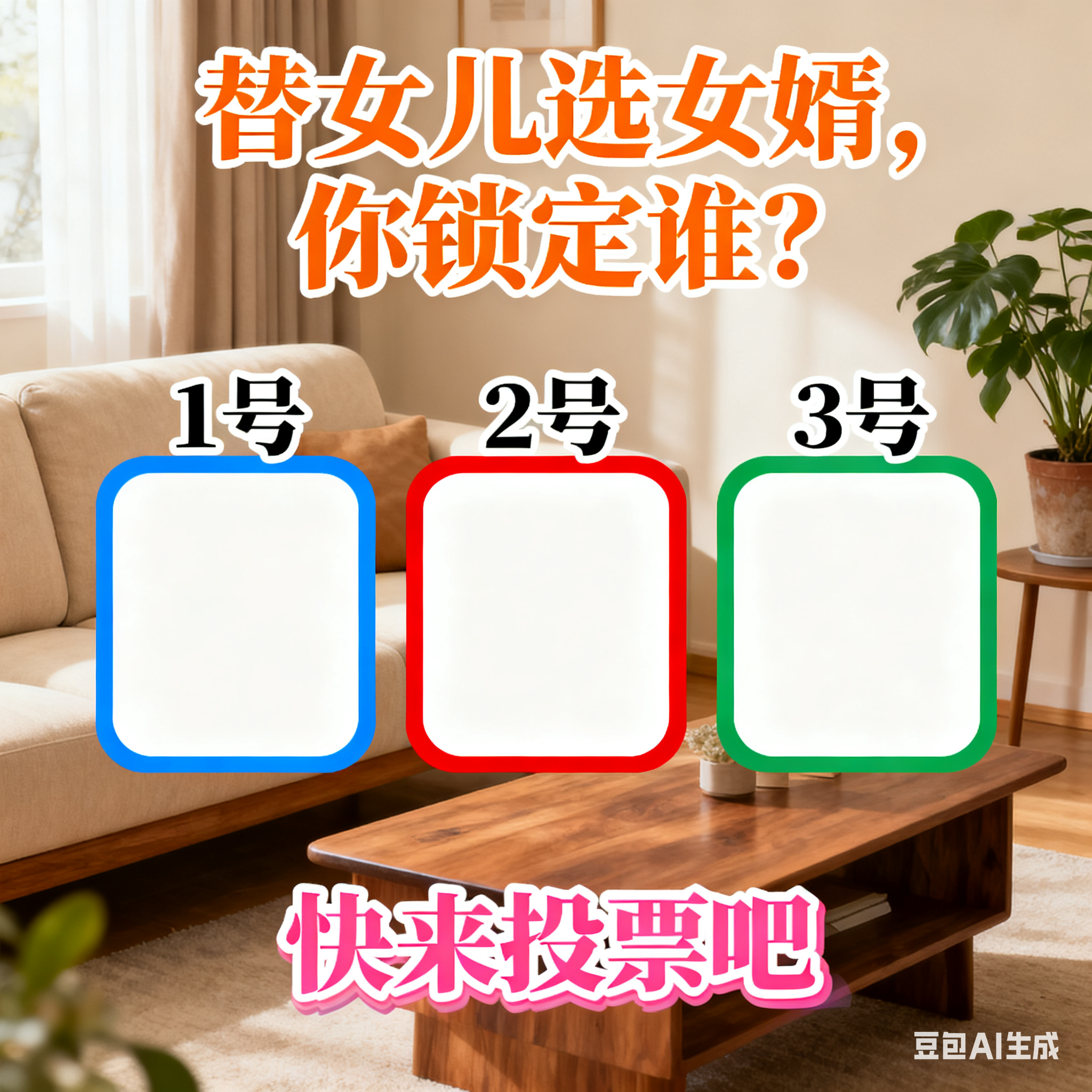 宝子们集合投票啦!两个灵魂拷问直击心坎~ 1. 若重新选结婚对象,你会pick三位中的谁?3号的选中概率你给多少? 2. 替女儿选女婿,你果断锁定谁?1号的选中概率你打几分? 快把答案砸评论区