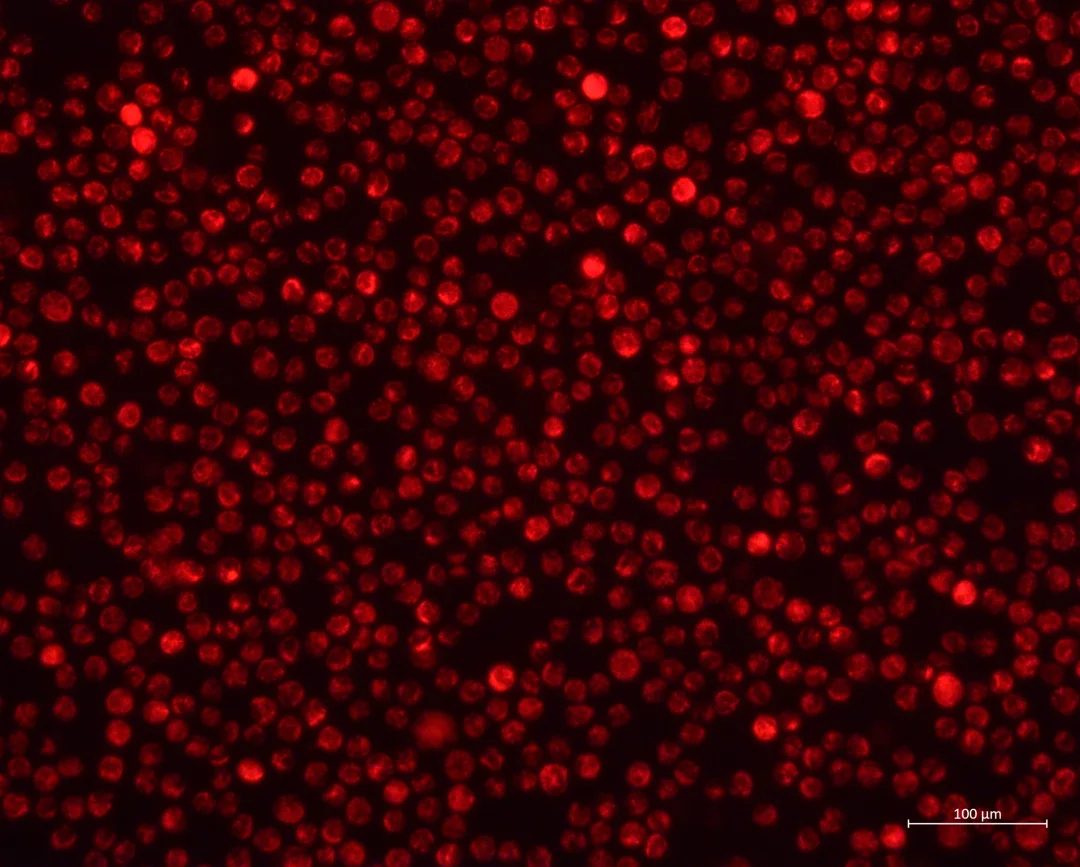 4、到时间后,拿出细胞到荧光显微镜下检查是否染上(注意避光),如果染上了就可以去洗细胞,用pbs洗