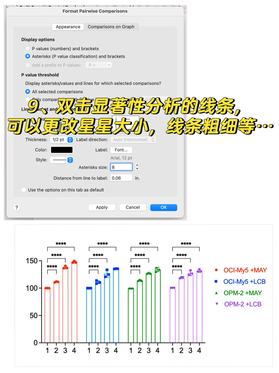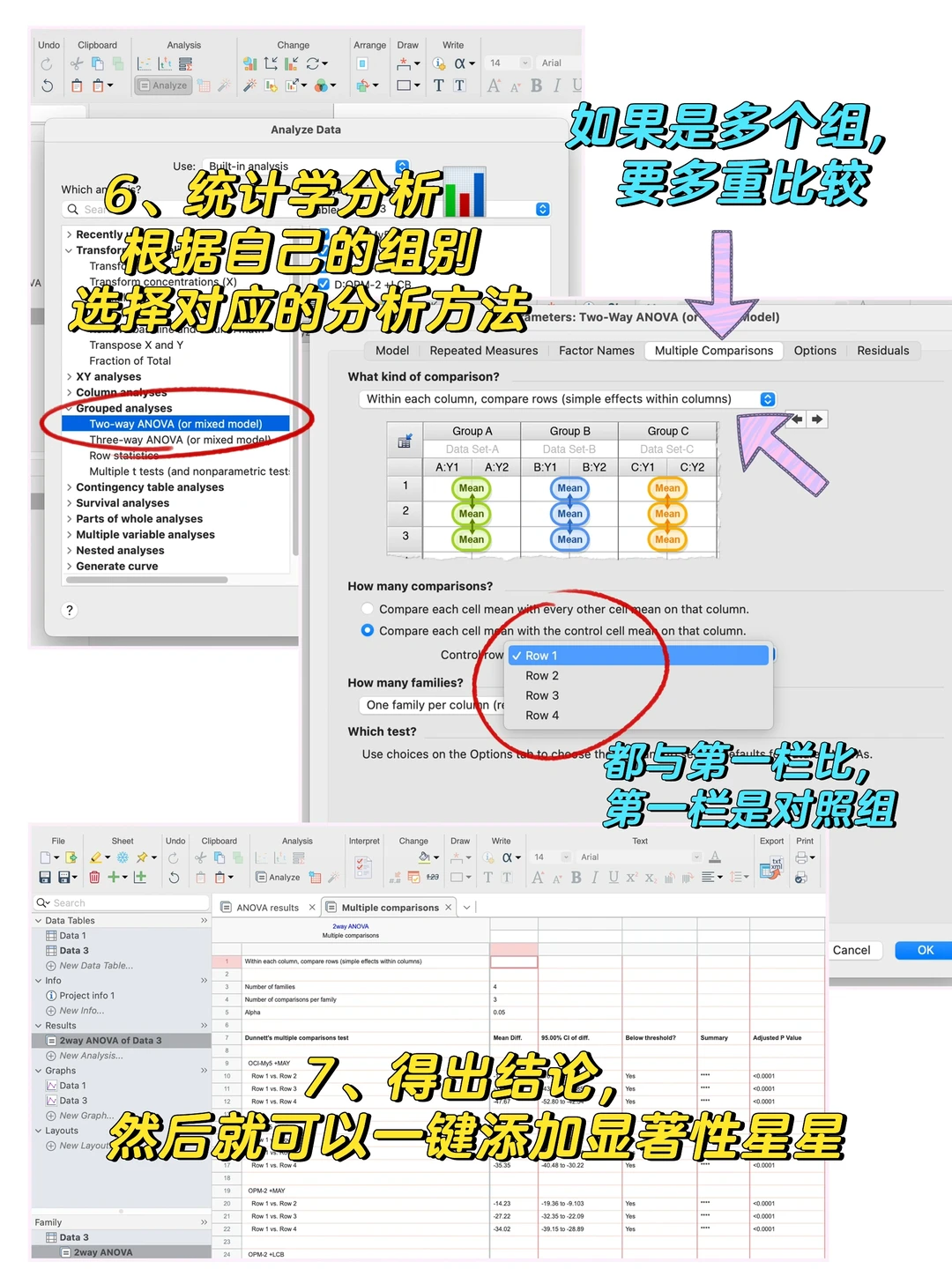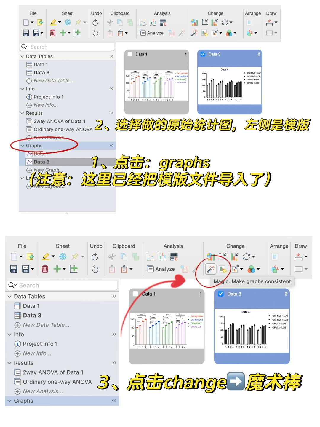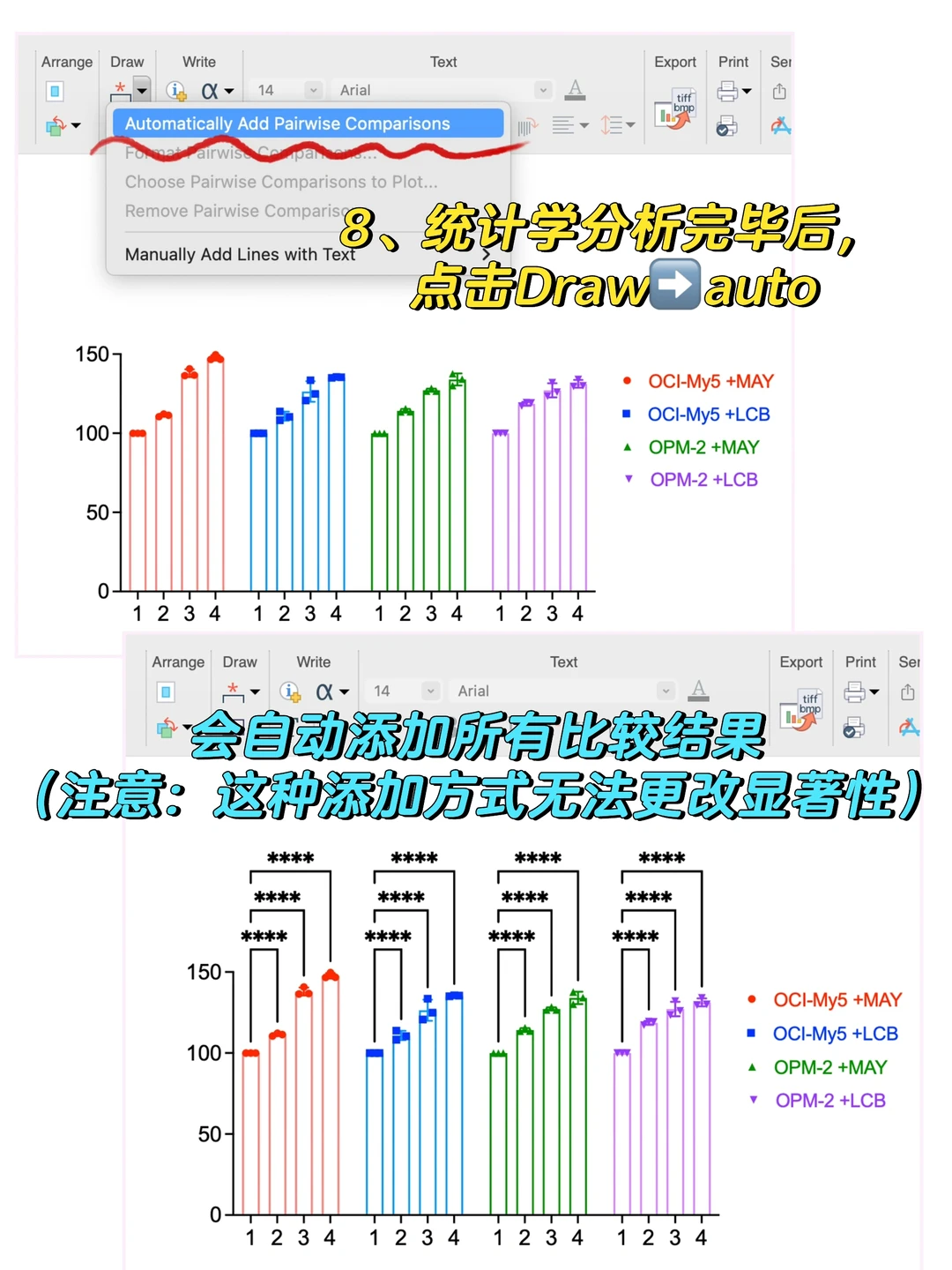 graphpad作图时,新的统计图可以之前做过的模板,这样所有统计图看起来就是相同的格式,观感会比较好,操作其实很简单,看P2和P3。[棒R] 统计图做好以后,根据组别和需求选择合适的统计学方法,添加显著性分析,🌟🌟是可以一键添加的,不用手动添加,具体操作看P4到P6❗️ ps:这种一键添加的方式是无法更改显著性星星的颗数的,如果算出来是4颗星,无法改成3颗星~ 根据自己需求看是否使用这种方法,有些要求最高就是3颗星,有些不要求❗️