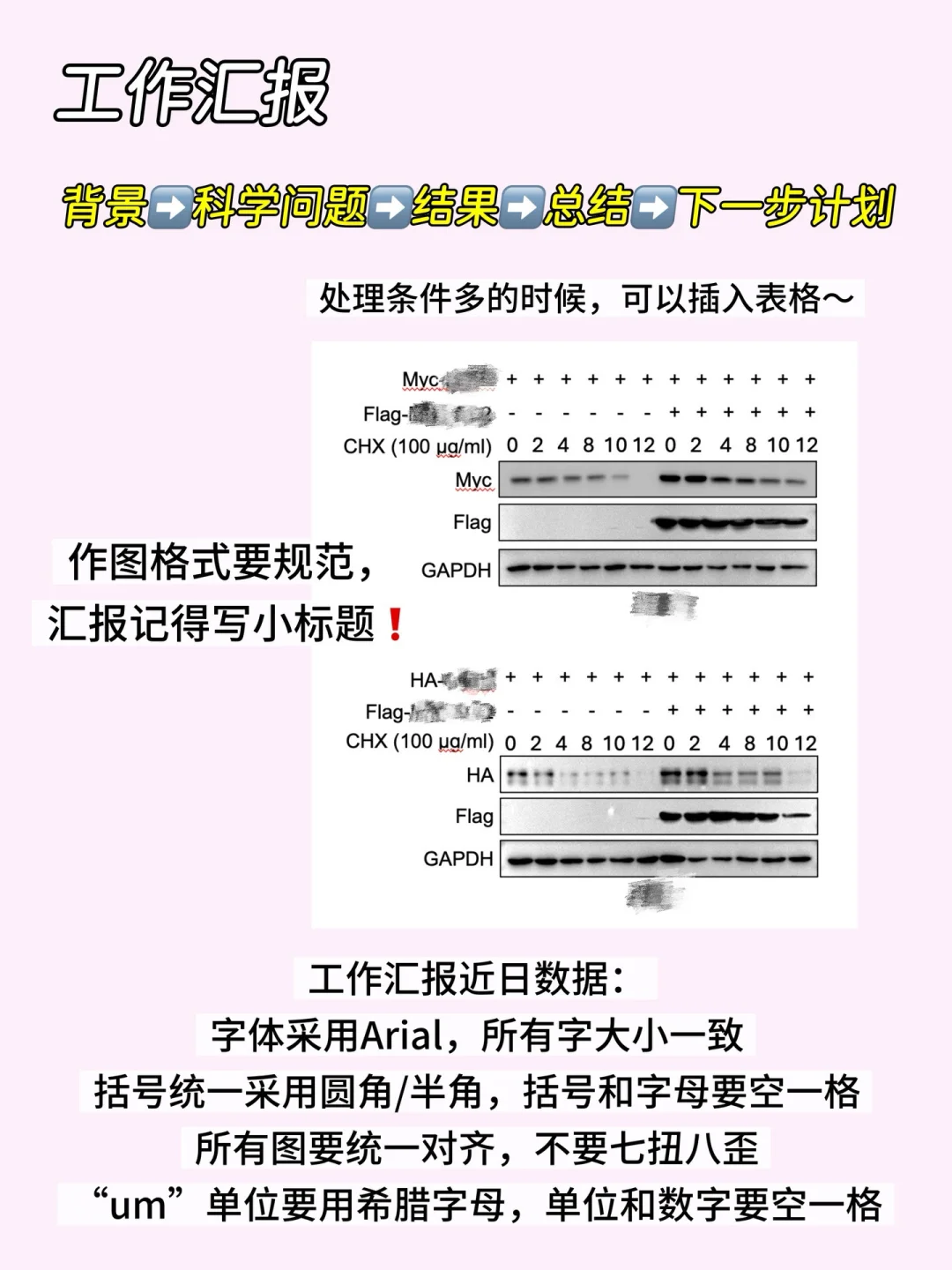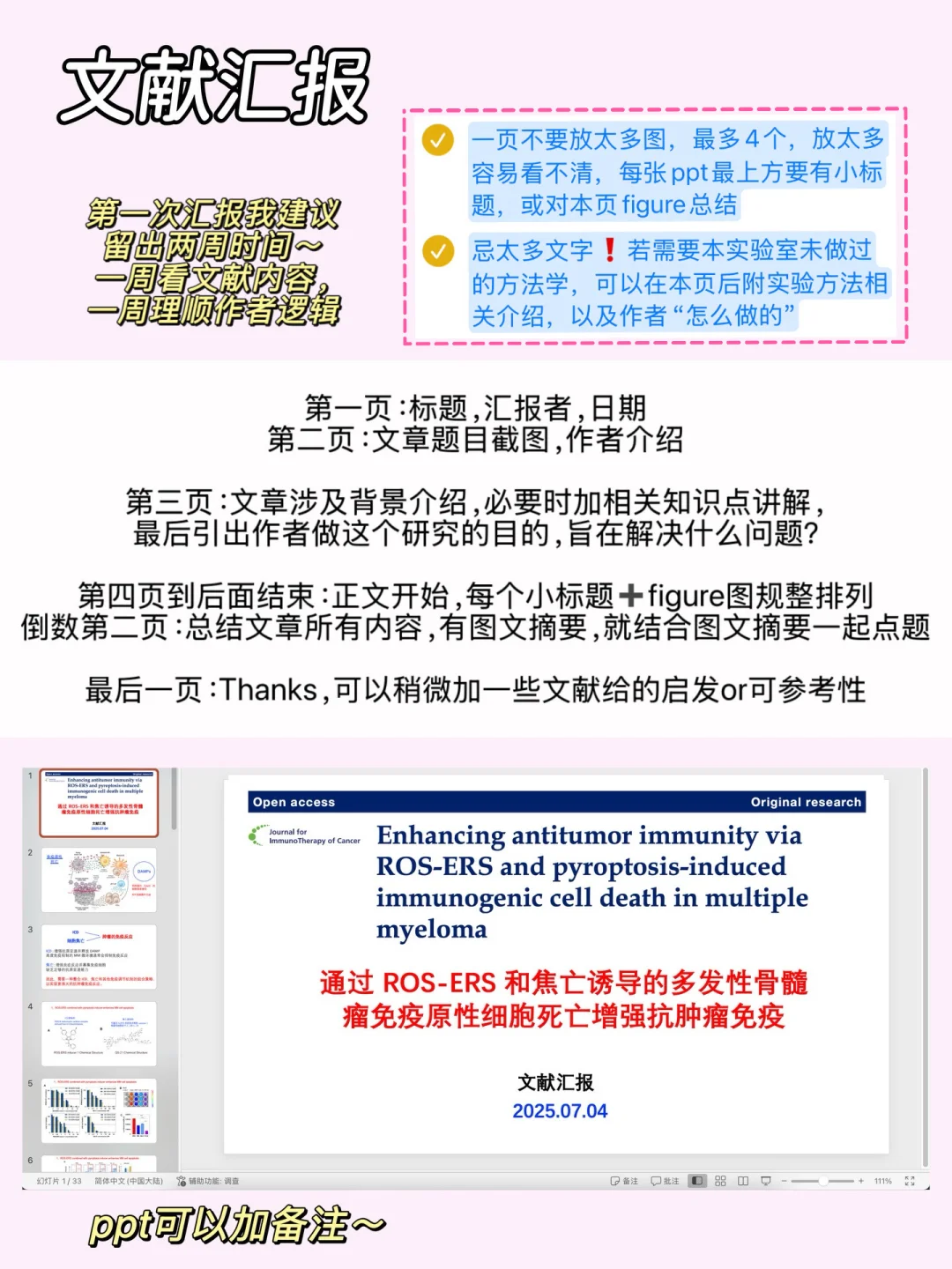 文献汇报:一页不要放太多图、用小标题区分板块、总结每页figure、精简字数、可附加没做过的实验技术。