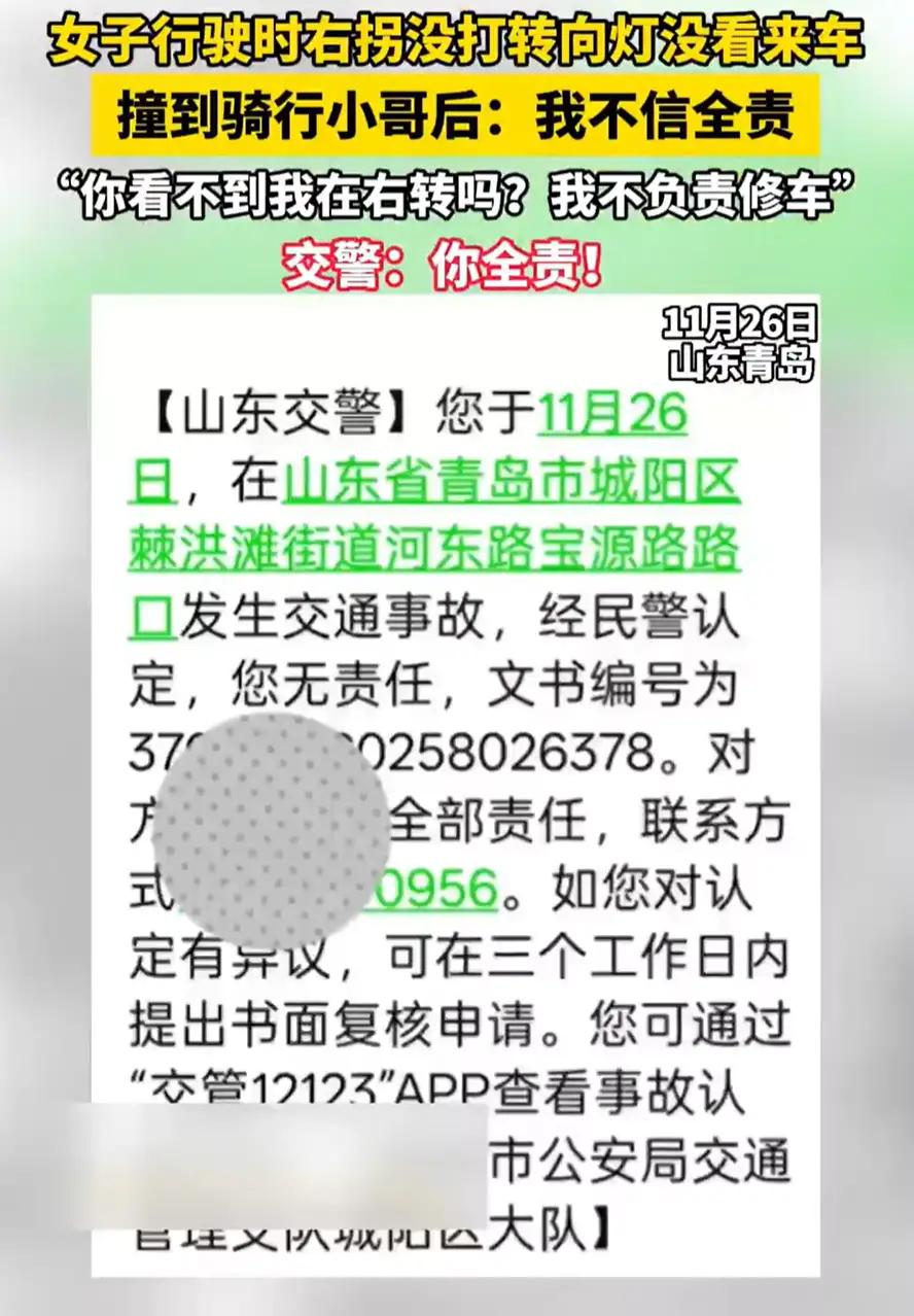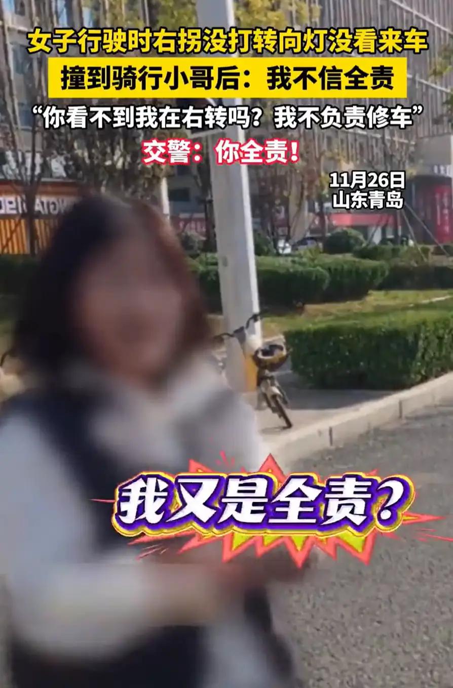 山东青岛,一女子开车右拐时没打转向灯,将一名直行的小哥给撞倒,小哥指责女子全责,要求修车,不料,女子不但没有道歉的意思,还反问了:“又是我全责?我不信!”网友:这个又字有点意思 视频中,一名女子驾车右转弯时未按规定开启转向灯,与正常直行的电动车发生碰撞,电动车小哥连人带车摔倒在地,车辆受损。 事故发生后,小哥起身检查车辆,发现车身已摔坏,随即向女子指出其未打转向灯的违规行为,认为此次事故应由女子负全责,并提出修车诉求。令人意外的是,女子下车后并未查看小哥的情况,也没有任何道歉的表示,反而一脸难以置信地反驳:“又是我全责?我不信! 双方僵持了一下,随后报了警,交警赶到后,根据现场勘查和交通法规,明确判定女子未按规定使用转向灯、未礼让直行车辆,承担此次事故的全部责任,并要求其承担小哥的车辆维修费用。 网友:“‘又字信息量很大,右转不打灯本身就是违规,撞到直行车辆还不认错,这态度也是没谁了” 此次事件也给广大司机敲响警钟,文明驾驶不仅是对他人负责,也是对自己负责。
