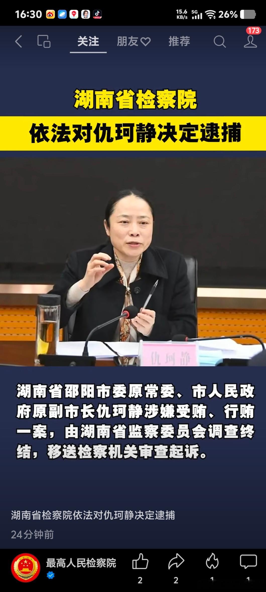 湖南省检察院依法对原邵阳市副市长仇珂静决定逮捕!(来源 : 湖南省检察院)