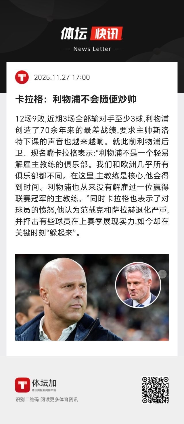 卡拉格:利物浦从来没有解雇过一位赢得联赛冠军的主教练。