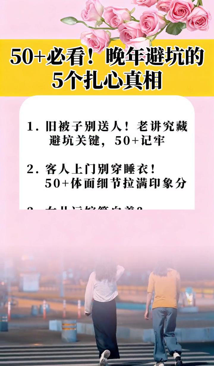 50+必看!晚年避坑的5个扎心真相。 ·1.旧被子别送人!老讲究藏,避坑关键,50+记牢。 ·2.客人上门别穿睡衣!50+体面细节拉满印象分。 ·3.女儿远嫁算白养?50+才懂的扎心现实。 ·4.维系关系不靠送礼,50+看透真心长久法则。 ·5.晚年生活靠谁?近子女才是你的硬核底气。