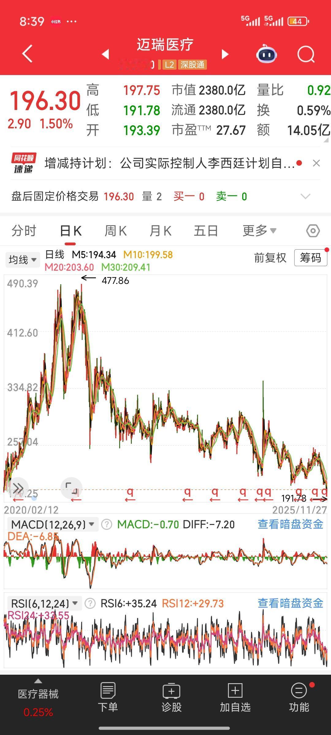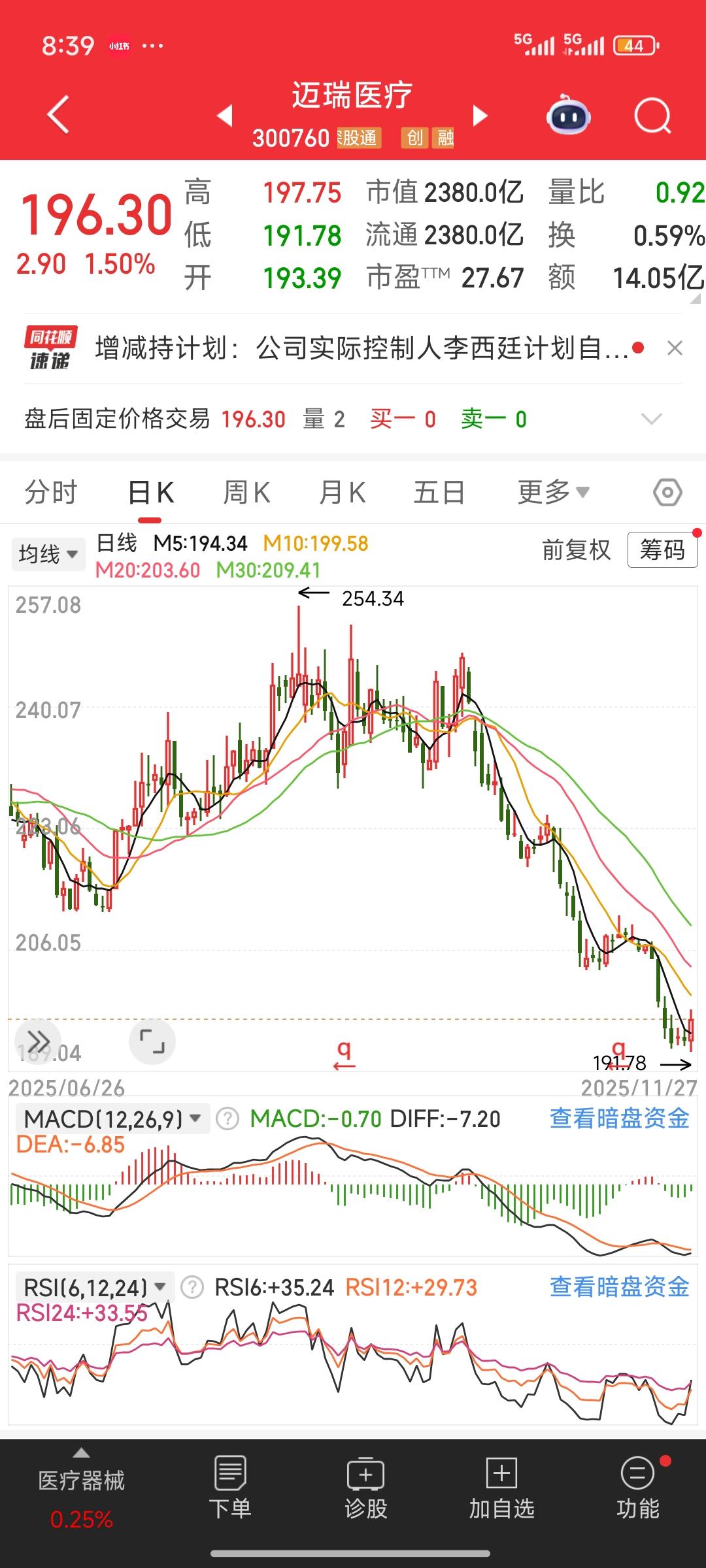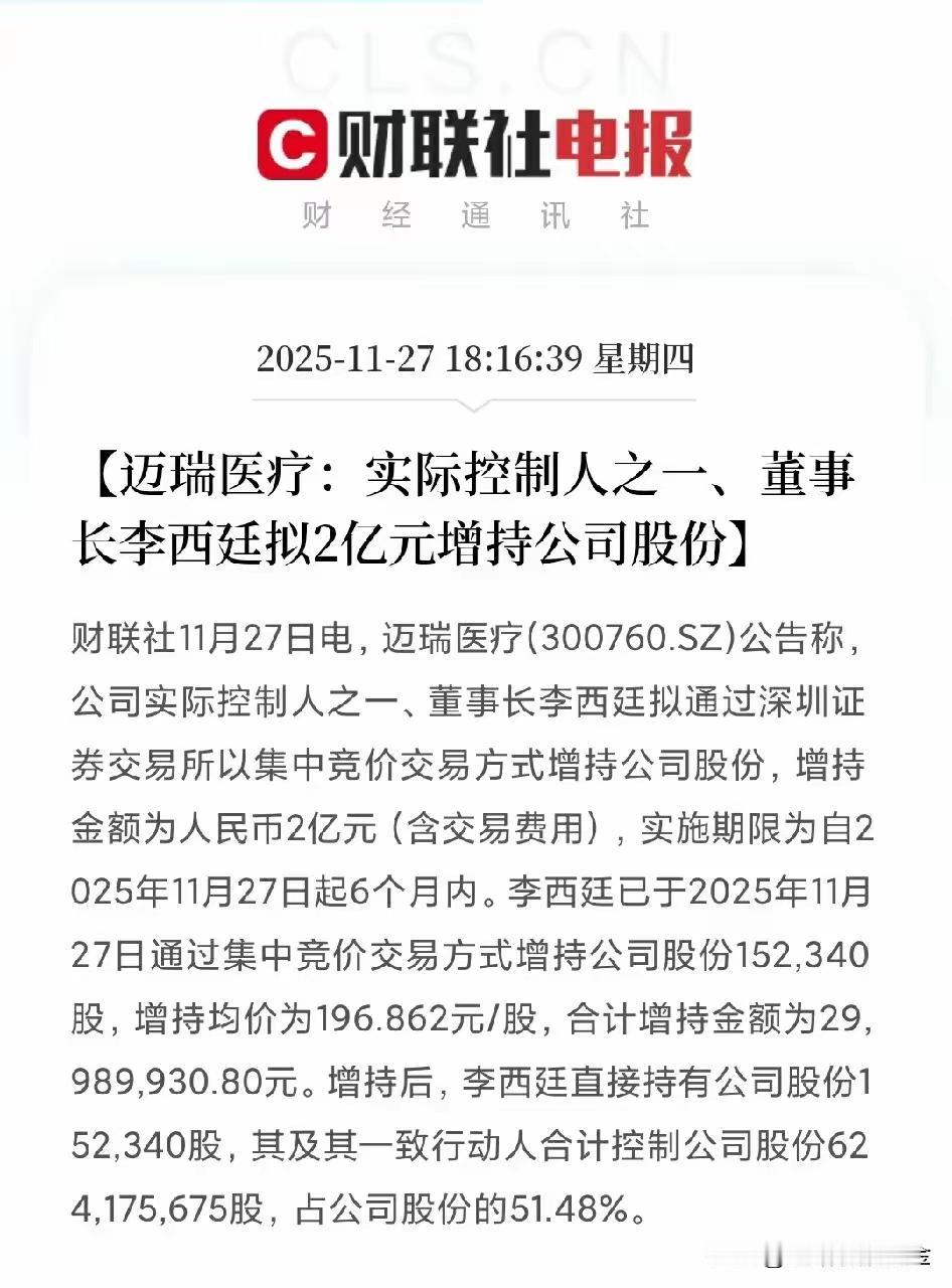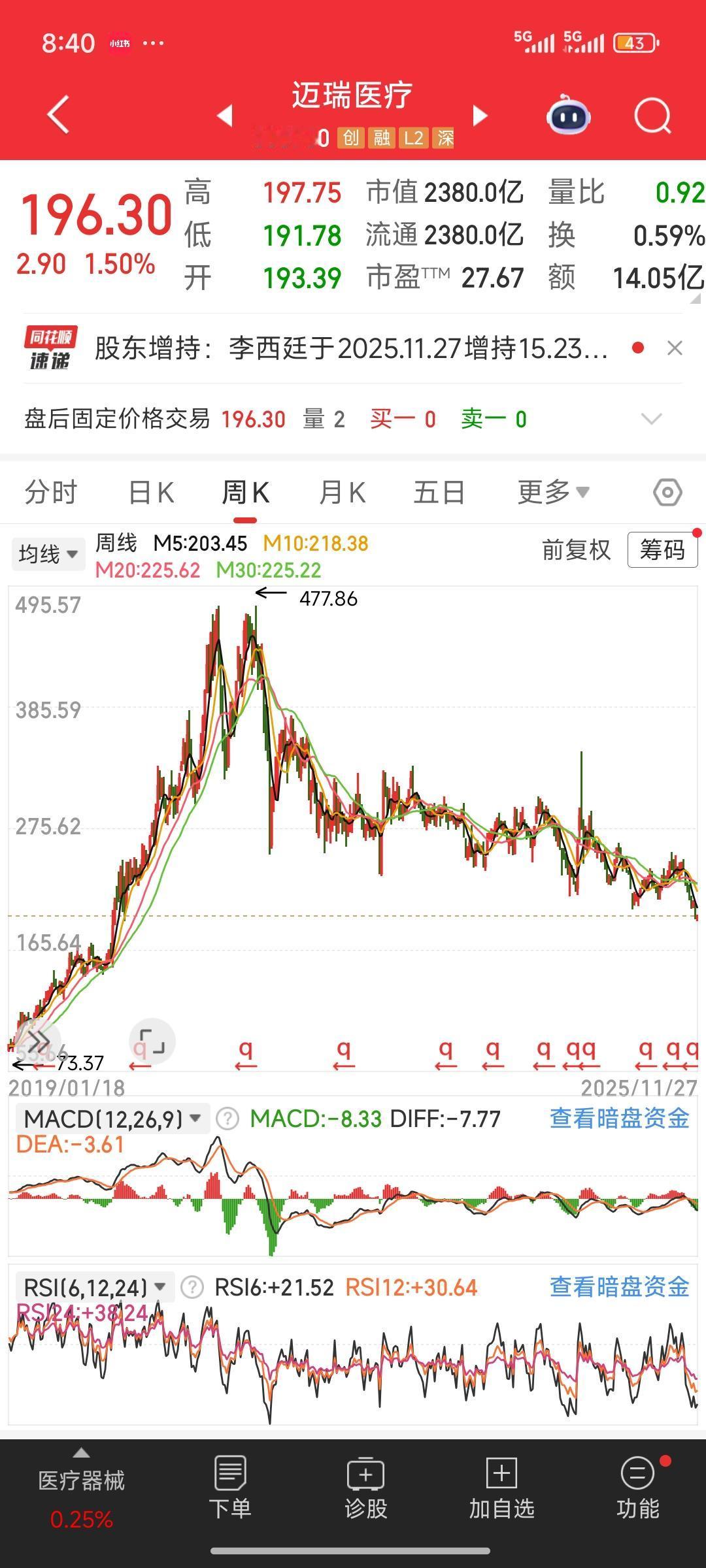 迈瑞医疗,今天迎来了董事长的2亿真金白银的增持。迈瑞股份上市之后,就迎来了上涨,股价最高涨到477元,是曾经的一个大牛股,同时它也是医疗器械板块的优质白马股,那么在医疗行业里也是口碑非常之佳,尤其在超声领域。更是国内有堪与国外同品质的这样一个品牌医疗器械公司。但是2021年之后近4年的股价是逐步下跌,近期更是创下了新低。董事长这2亿的增持,是真金白银的,但能否阻挡股价的下降,迎来一波上涨呢,还是仅仅是螳臂当车不自量力的多此一举呢? 不管怎么样对于董事长这种维护股价,这样一个真金白银的行为,我们身为股民是真心实意的赞起来,为之喝彩鼓掌。也期待a股上市公司的各位老总啊,以及公司的高层呢,都能够向这位老板看齐啊,真心实意的拿出真金白银来维护自己的股价,爱护自己的公司的品牌形象,那么我们a股就有希望,也有可能创造像像印度,越南、日本、美国这样的一个长期牛市的这样一个趋势。迈端医疗 迈瑞集团 迈瑞医疗待遇