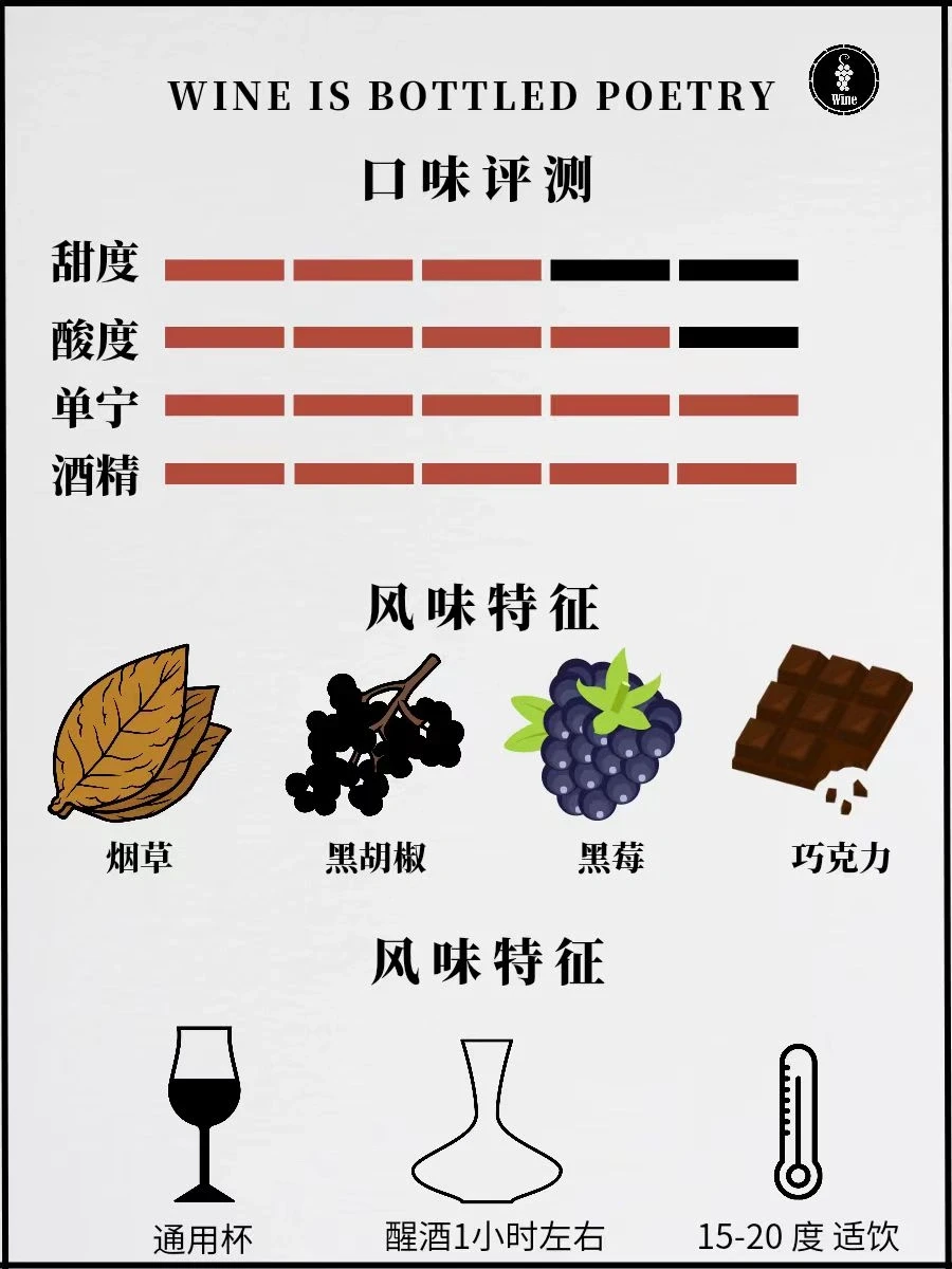 🍷口味评测:Syrah通常口感干爽、酒体饱满、单宁饱满、酸度适中。