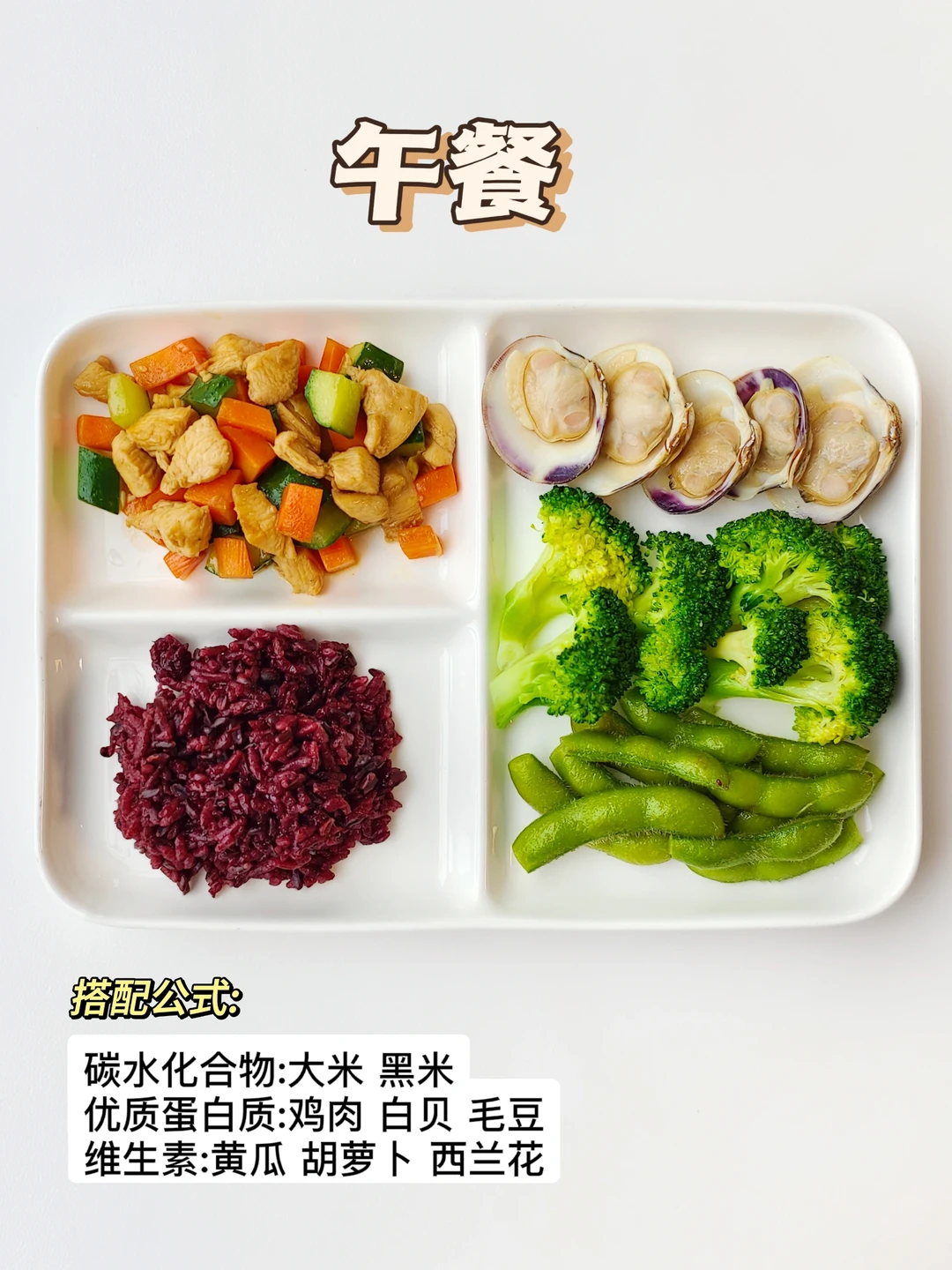 给米饭➕鸡胸肉炒黄瓜➕五香盐水毛豆➕西兰花➕白贝