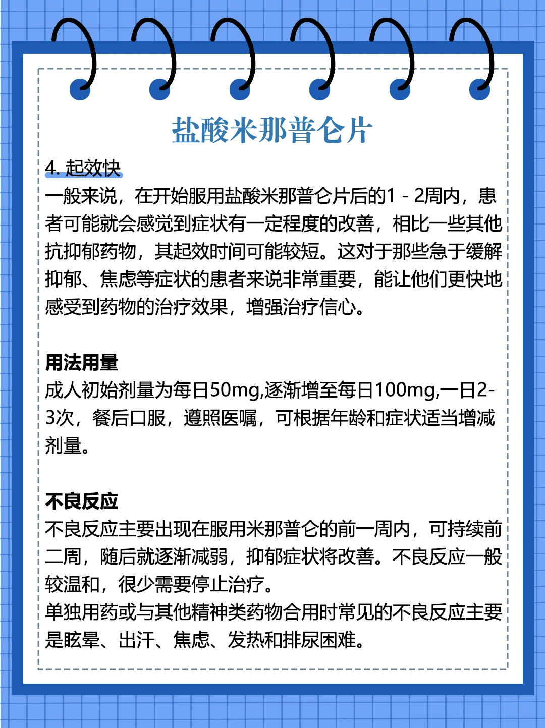 一般来说,在开始服用盐酸米那普仑片后的1 - 2周内,患者可能就会感觉到症状有一定程度的改善,相比一些其他抗抑郁药物,其起效时间可能较短。