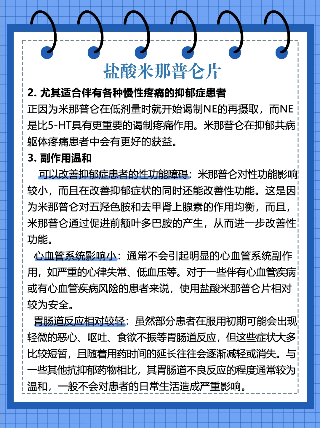 正因为米那普仑在低剂量时就开始谒制NE的再摄取,而NE是比5-HT具有更重要的谒制疼痛作用。米那普仑在抑郁共病躯体疼痛患者中会有更好的获益。