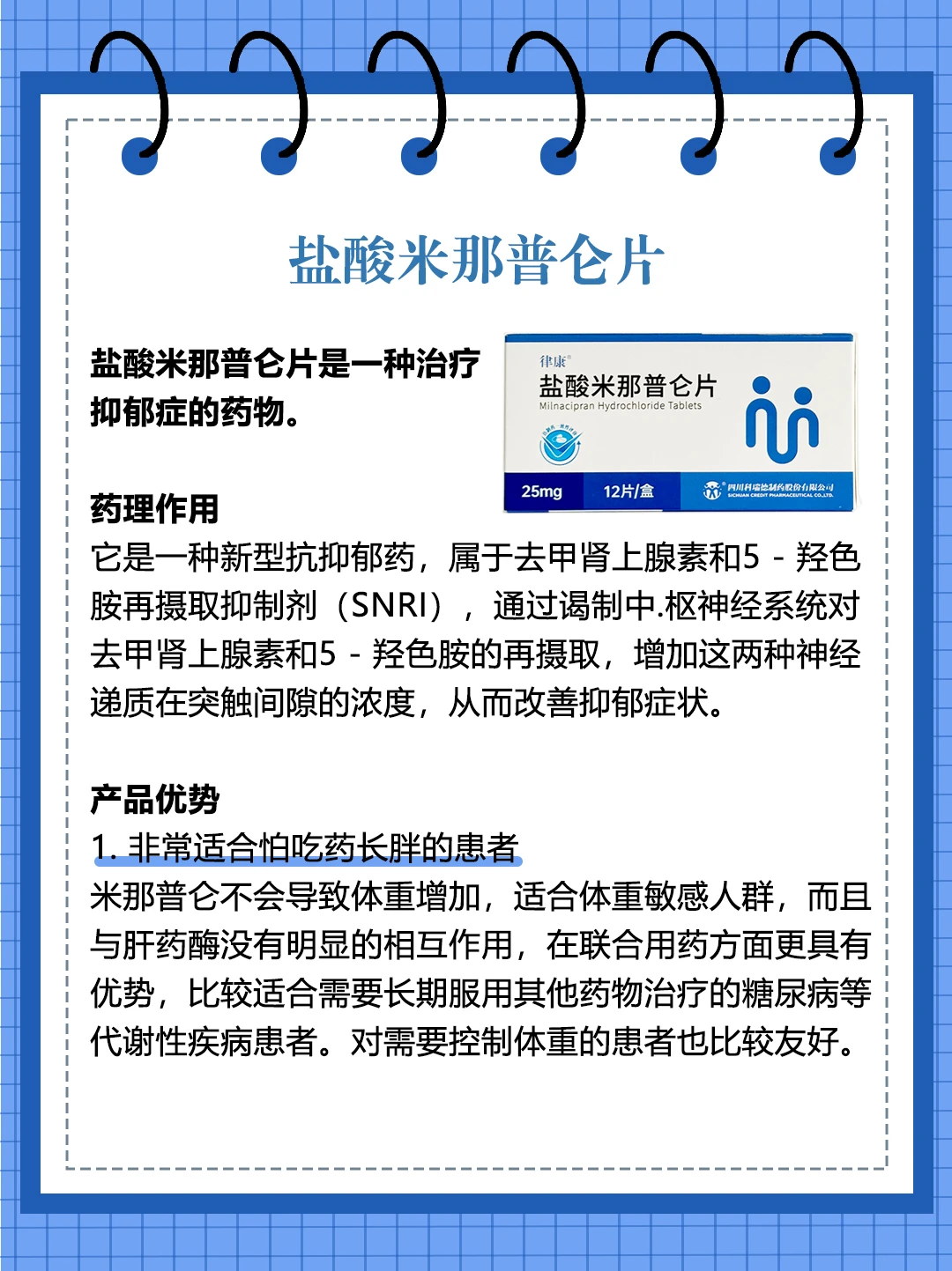 米那普仑不会导致体重增加,适合体重敏感人群,而且与肝药酶没有明显的相互作用,在联合用药方面更具有优势,比较适合需要长期服用其他药物治疗的糖尿病等代谢性疾病患者。对需要控制体重的患者也比较友好。
