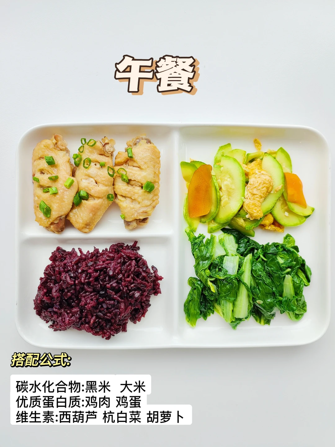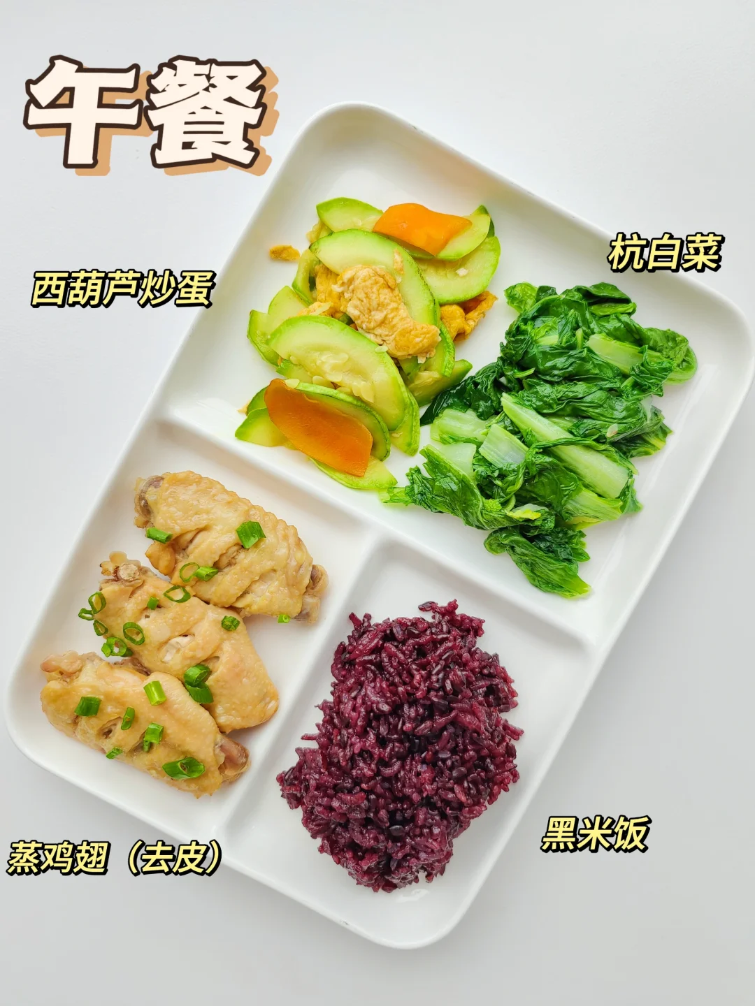 黑米饭➕蒸鸡翅➕西葫芦炒蛋➕杭白菜