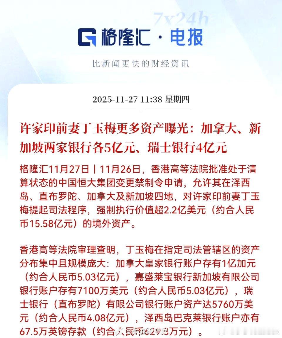 许家印前妻丁玉梅的海外隐秘资产持续曝光,最新披露的信息显示其跨境资产规模远超此前预期:加拿大皇家银行、新加坡星展银行分别持有现金及理财产品各5亿元人民币,折合共计10亿元;瑞士银行账户中则存有4亿元人民币的外汇存款及结构性产品,仅三大海外银行的可变现资产合计已达14亿元。此外,有消息称丁玉梅通过家族信托间接持有香港两处商业地产(估值约3.2亿元)、海外私募股权基金份额(账面价值约2.8亿元),其个人名下跨境资产总规模或已突破20亿元。这些资产多通过离岸公司、信托架构搭建隔离,且集中在低税辖区及硬通货资产,与恒大集团债务危机爆发前的资金转移时间线高度吻合。财经股票