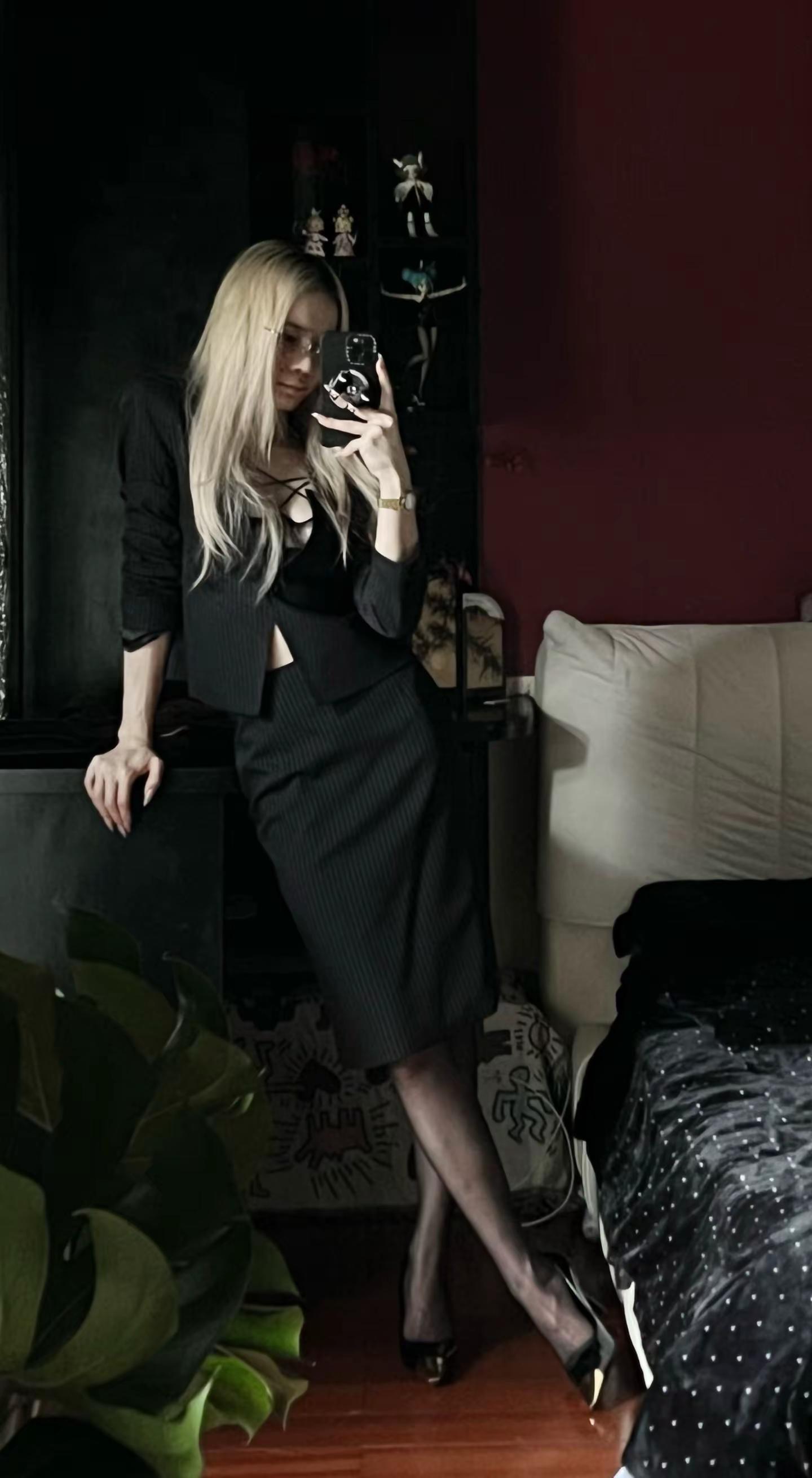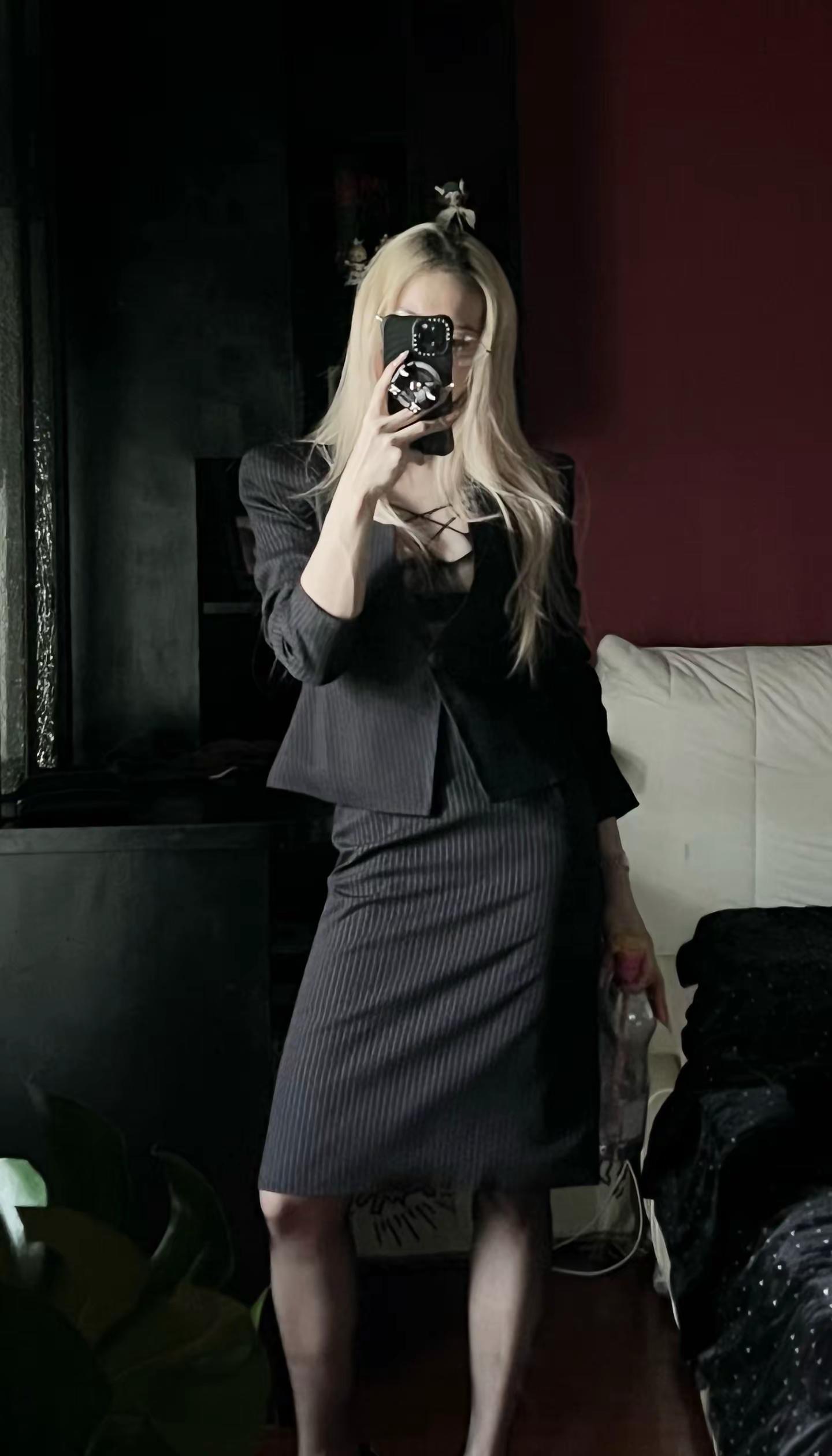 她坐在灰色的柜面上,米色针织上衣和黑色短裤勾勒出松弛又利落的线条。一只...