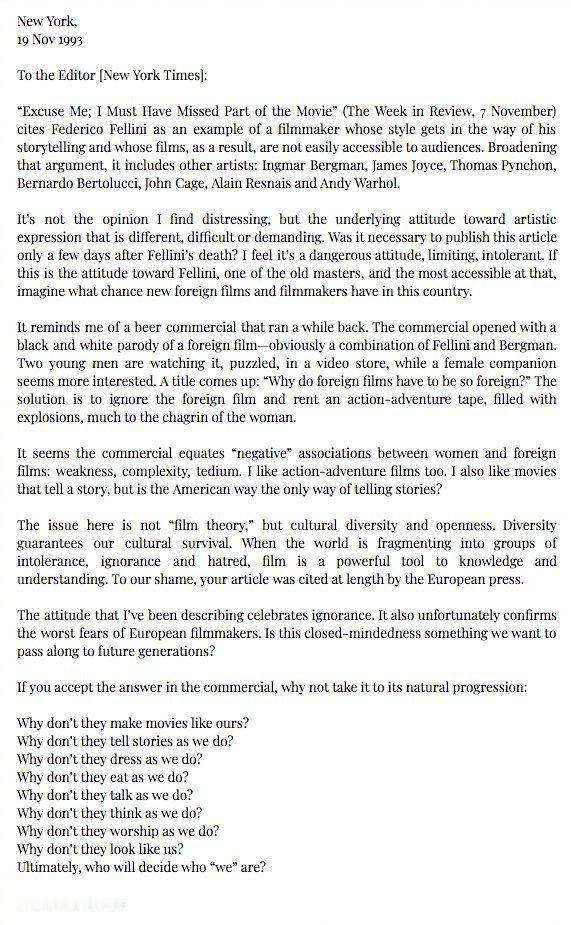 1993年,《纽约时报》发表评论文章,指责费德里科·费里尼(《八部半》导演)和其他一些外语电影“晦涩难懂”。对此,马丁·斯科塞斯写下了这封相当有力的回信作为回应。致《纽约时报》编辑:文章《抱歉:我肯定是漏看了电影的某些部分》(“回顾一周”栏目,11月7日),以费德里科·费里尼为例,称其风格妨碍了叙事,导致影片不易为观众所接受。文章进而将这一论点扩展至其他艺术家:英格玛·伯格曼、詹姆斯·乔伊斯、托马斯·品钦、贝纳尔多·贝托鲁奇、约翰·凯奇、阿伦·雷乃和安迪·沃霍尔等。令我感到不安的并非文中的观点,而是它对那些与众不同、晦涩难懂或要求甚高的艺术表达方式所持的根本态度。在费里尼逝世仅数日之后,是否有必要刊登这样一篇文章?我认为这是一种危险的、狭隘的、偏执的态度。倘若对费里尼这样一位大师级人物,且是其中最为平易近人者,都尚且持此态度,试问新的外语电影和电影人在这个国家还能有多少机会?这让我想起不久前播出的一则啤酒广告。广告开头是对一部外国电影的黑白戏仿,它明显融合了费里尼和伯格曼的风格。两个年轻男子在音像店观看此片,困惑不解,而一位女性同伴却似乎更感兴趣。出现的字幕写着:“为何外国电影非要如此'外国'?”解决方式竟是忽略这部外国电影,转而租下一部充满爆炸场面的动作冒险片,令那位女士颇为懊恼。这则广告似乎将女性与外国电影共同置于“负面”联想之中:软弱、复杂、乏味。我也喜欢动作冒险片。我也喜欢讲述故事的电影,但难道美国的方式是讲述故事的唯一方式吗?这里的关键并非“电影理论”,而是文化多样性与开放精神。多样性保障了我们文化的生存。当世界正分裂为充满偏执、无知和仇恨的群体时,电影是获取知识与理解的有力工具。令人遗憾的是,贵报的这篇文章被欧洲媒体大量引用。我所描述的此种态度,实则是为无知张目。不幸的是,它也印证了欧洲电影人最深的恐惧。这种封闭的心态,难道是我们想要传递给后代的吗?若你接受广告中给出的答案,何不循其逻辑推演至终:为何他们不照我们的方式拍电影?为何他们不照我们的方式讲故事?为何他们不照我们的方式穿衣?为何他们不照我们的方式进食?为何他们不照我们的方式言谈?为何他们不照我们的方式思考?为何他们不照我们的方式崇拜?为何他们不长得与我们一样?最终,谁将决定“我们”是谁?——马丁·斯科塞斯佳片奇遇季马丁斯科塞斯英格玛伯格曼