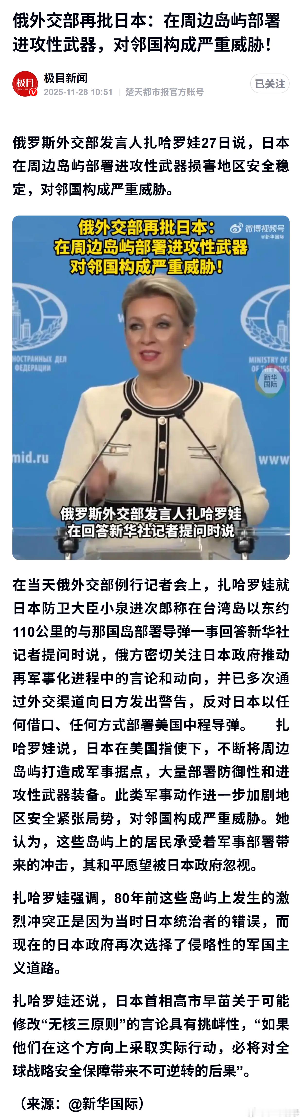 俄外交部再批日本:在周边岛屿部署进攻性武器,对邻国构成严重威胁!