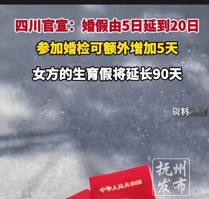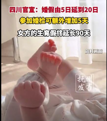 四川人民有福了!新人福利来了,鼓励结婚生育一波福利假期,让你妥妥的幸福感、安全感! 婚假:由5天延长到20天,参加婚检增加5天,最多可拿到25天婚假,度个小蜜月满满足够,完全不用请假。 生育假:国家法定产假98天,四川省在此基础上延长了90天,生育假达到188天,宝宝可以带到半岁左右,满满的的母爱,生育三孩再增加30天,生育假达到218天。 男方护理假:国家法定的15天延长至30天,为照顾妻儿充足的满满的保障。可以陪伴妻女一起度过坐月子,担当起照顾妻子责任,促进亲子感情,有利于妻子产后恢复,缓解月子焦虑感,有安全感。
