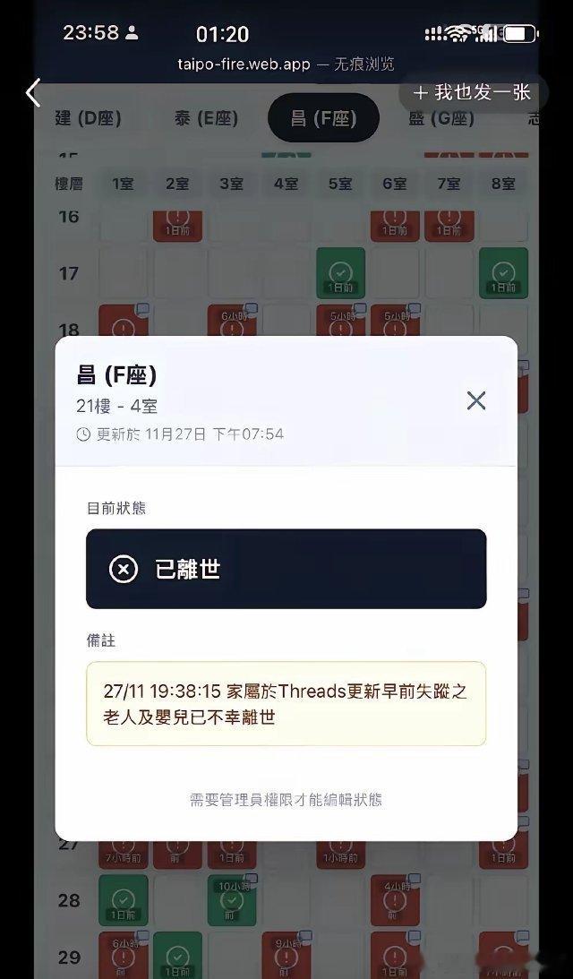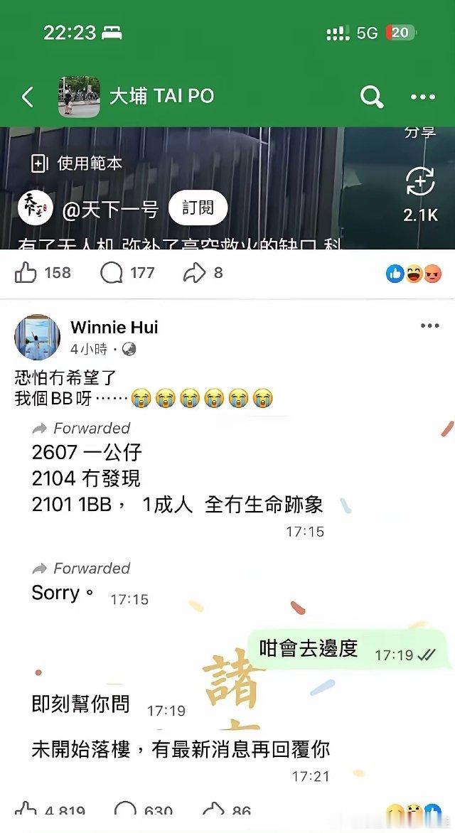 太令人窒息了!香港大埔宏福苑死伤人数还在增加。截止11月28日零时,大埔宏福苑大火已至83死76伤。那个在face book群组里一直发消息找宝宝的年轻妈妈也得到了不好的消息。看到她绝望打出“没有希望了”的文字,真的忍不住眼眶潮湿。她半岁的宝宝,和宝宝的爷爷奶奶都在火灾中不幸遇难。希望死伤人数不要再增加了