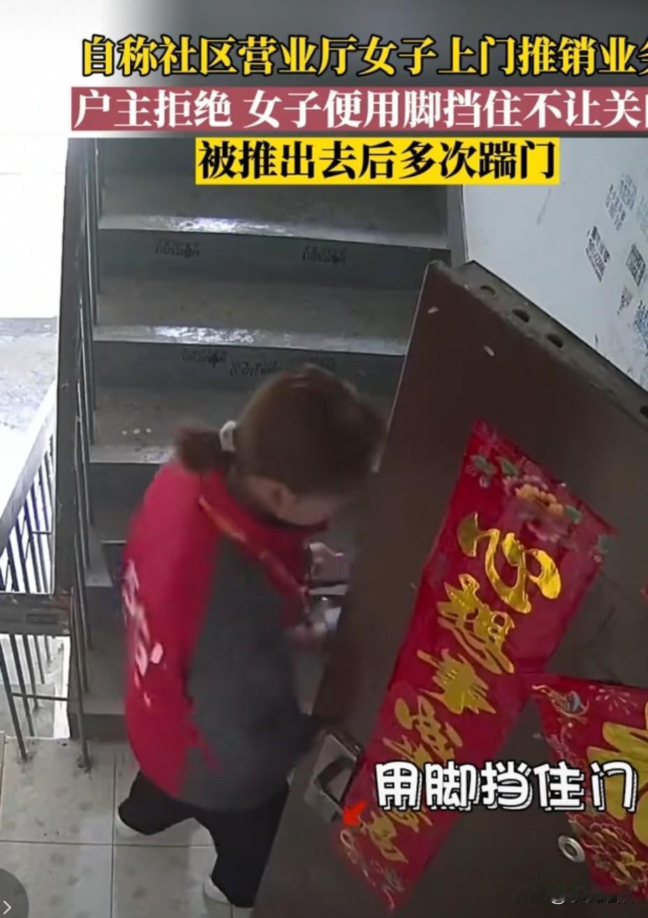 这个推销的女人太可恶了!某地一小区楼上,一穿着红色背心的女子敲开一住户的门后,自称是社区营业厅的业务员,向其推销5G网络业务,住户称不需要该业务,随即准备关门,谁知女子拉住门后不放,住户将其推开后将门关闭,女子气的连踹几脚大门。 见过推销的,没见过这种推销的,就这种态度还想让顾客办业务,没挨顿揍就算不错了,这种无职业素养的业务员如果自身不改正,不但不会有业绩,反而会给其背后的企业造成不良影响。