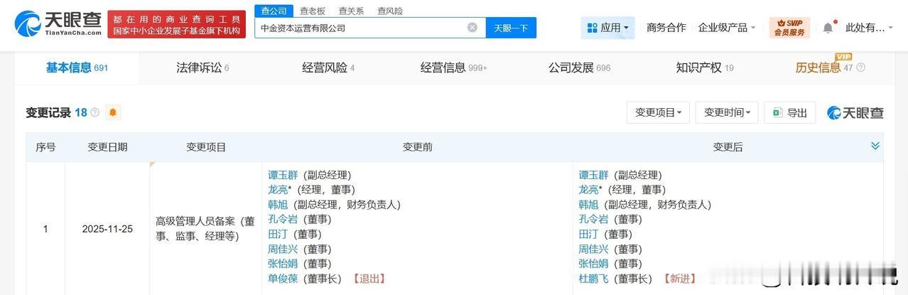 【中金资本董事长发生变更 杜鹏飞任中金资本董事长】 天眼查工商信息显示,近日,中金资本运营有限公司发生工商变更,单俊葆卸任董事长,由杜鹏飞接任。 该公司成立于2017年3月,法定代表人为龙亮,注册资本20亿人民币,经营范围为资产管理、投资管理、项目投资、投资咨询,由中金公司(601995)全资持股。 据媒体此前报道,中金资本运营有限公司董事长单俊葆已失联。值得注意的是,中金资本官网上展示的董事及高级管理人员名单中并没有单俊葆的信息。 天眼查信息: