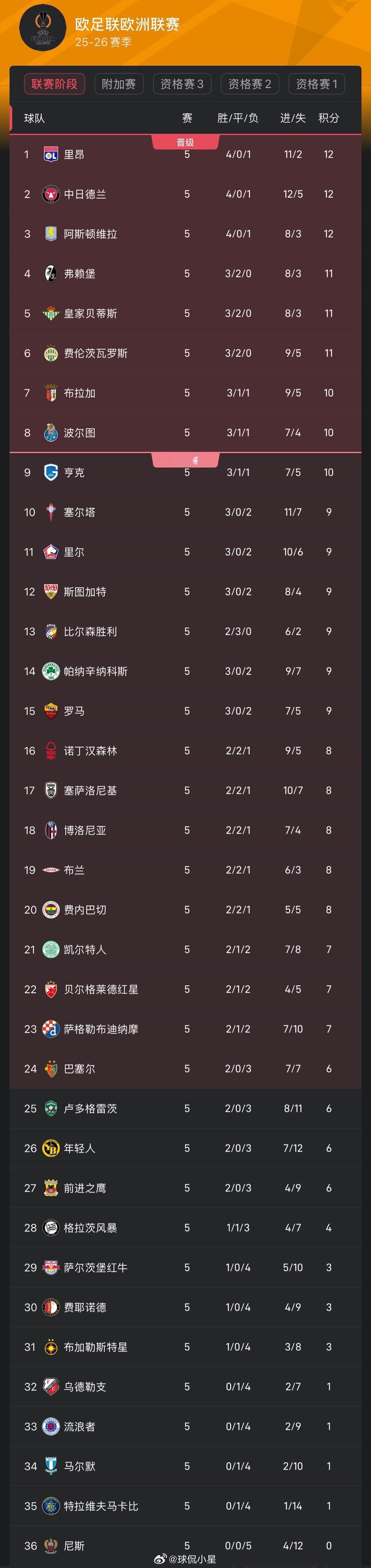 今晨,欧联联赛阶段第五轮轮全部结束。目前,里昂、中日德兰、维拉均4胜1负,三队同积12分,暂列前三。弗赖堡、贝蒂斯、费伦茨瓦罗斯均为3胜2平,成为欧联赛场截至目前3支不败的球队。