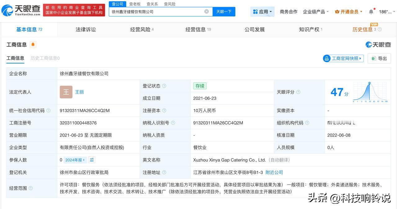 【擅自办演出被罚烧烤店去年0人参保 揭秘擅自办演出被罚烧烤店】烧烤店因擅自办演出被罚9万 近日,徐州市文化广电和旅游局对徐州鑫牙缝餐饮有限公司作出行政处罚决定。该公司因违规擅自举办演出,被没收演出设备并罚款9万元。 天眼查App显示,徐州鑫牙缝餐饮有限公司成立于2021年6月,法定代表人为王丽,注册资本10万人民币,经营范围包括餐饮服务、餐饮管理等,由王丽、徐玲共同持股。年报信息显示,该公司2024年参保人数为0。 天眼查信息: