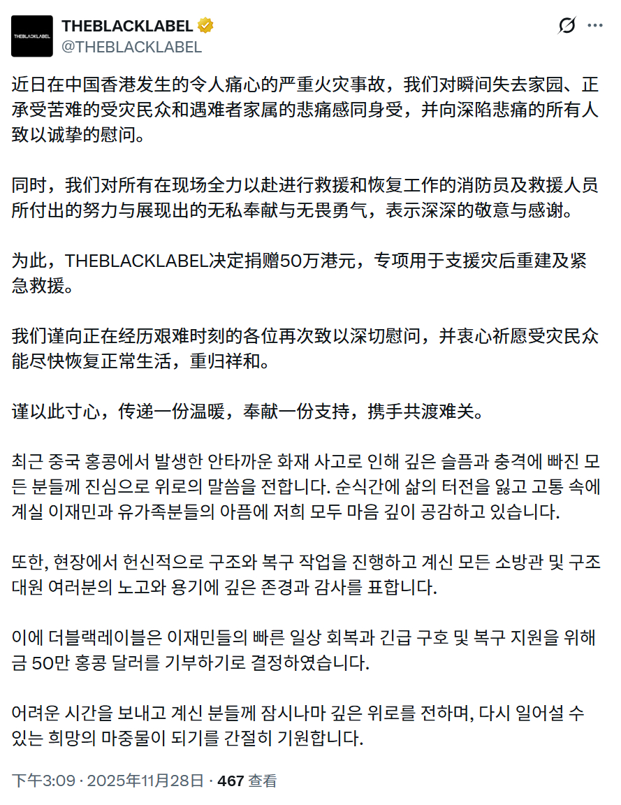 【Twi】THEBLACKLABEL向中国香港火灾救援捐赠50万港币