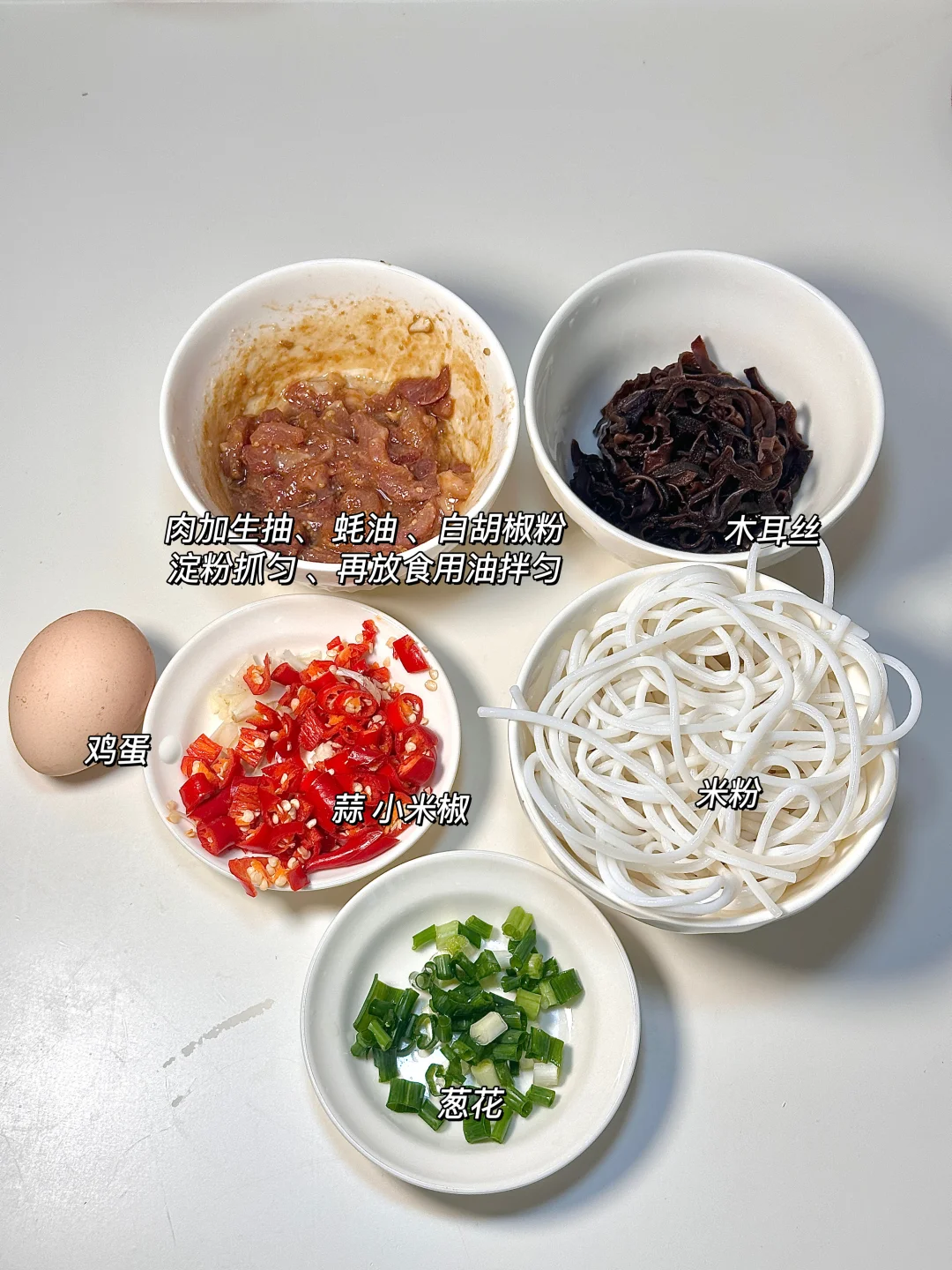 ✨食材:木耳 猪肉 鸡蛋 米粉 蒜 小米椒 葱