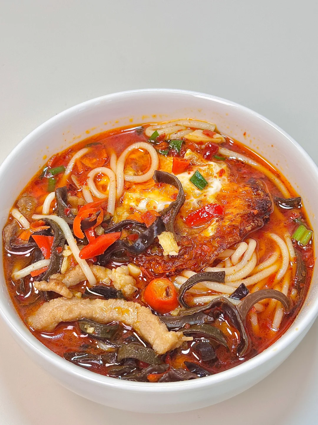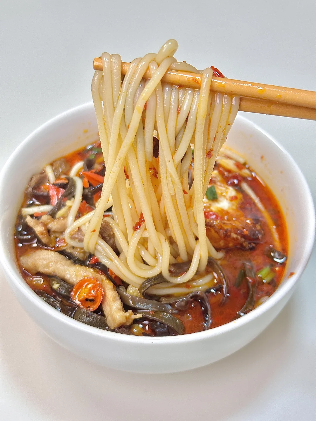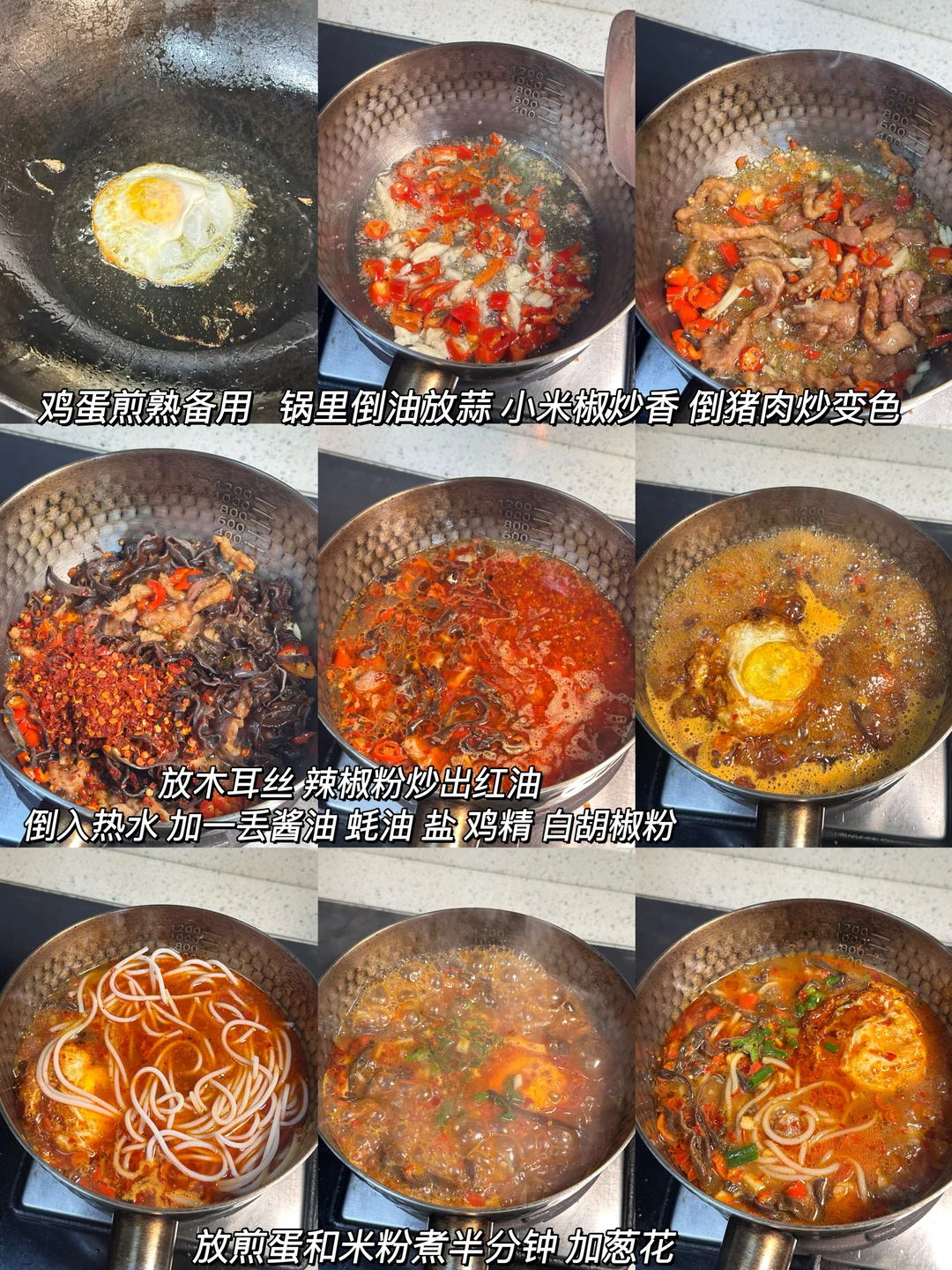 锅里倒油烧热,把鸡蛋煎好后盛出来,放蒜 小米椒炒香 倒入猪肉炒变色,放木耳丝 辣椒粉炒出红油。倒入热水煮开,调味加一点酱油 蚝油 盐 鸡精 白胡椒粉。