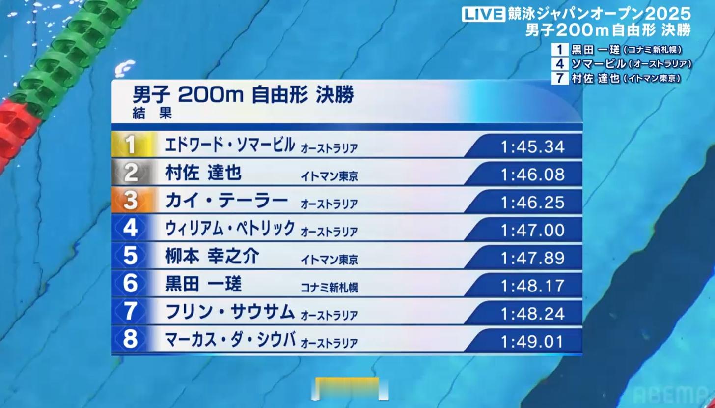 日本游泳公开赛 男200自决赛Edward Sommerville 1:45.34 村佐达也 1:46.08