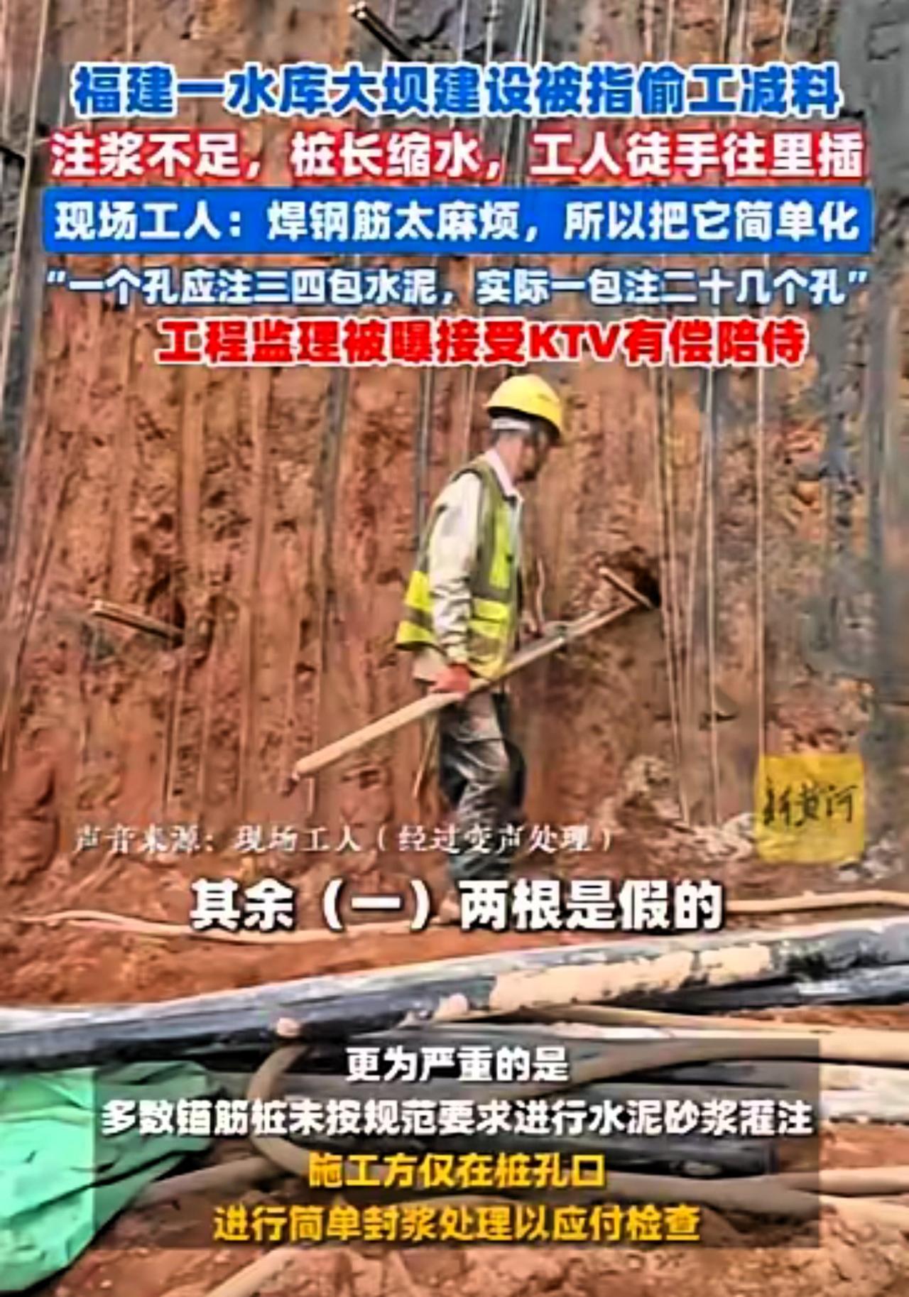福建,一水库严重偷工减料,一根桩里3、4根钢筋,只有一根是真的,其余都是假的;一根桩里本应注入20袋水泥,现在却一袋水泥要灌20个桩孔。现场一名从业多年的工人实在看不下去了,偷偷用变声电话联系到记者,说出了实情,这个严重偷工减料的事件才被报道了出来。 我的天呐,这哪是建水库,分明是在埋定时炸弹!咱先把话说透——这个出问题的水库可不是小工程,是福建永安抽水蓄能电站的下水库,国家抽水蓄能“十四五”重点项目,本该是能扛200年一遇洪水的放心工程,结果被施工方搞得比纸糊的还不靠谱。记者实地调查后曝光的细节,比工人爆料的还离谱,真让人脊背发凉! 按设计图纸要求,大坝坝肩的锚筋桩得是三根标准钢筋加钢管、注浆管焊接成整体,长度要达到12米,这样才能牢牢锁住岩土体,防止边坡垮塌。可实际施工中呢?后期600多根已完工的桩里,多数只是把三根钢筋简单点焊,有的甚至直接插根单根钢筋就完事,更别提核心的注浆管了,很多桩孔里压根就没装。工人说,有的钢筋长度才3到5米,连设计要求的一半都不到,三根钢筋还长短不一,用锤头轻轻一敲就松动,甚至能往桩孔里移位,这哪能起到加固作用? 水泥的偷工减料更是刷新底线!工人爆料“一袋水泥灌20个桩孔”还真不是夸张,按施工规范,每个桩孔至少得用4袋水泥分次注浆,才能保证桩体和岩土体紧密嵌合。可施工方为了省成本,直接在桩孔口简单封点砂浆就应付检查,大部分桩孔里都是“空的”,专家算了算,这种操作会让大坝抗滑移能力直接降低30%-50%,一旦遇到暴雨洪水,边坡很可能直接垮塌,连带整个大坝都有危险。 最让人佩服的就是那个匿名举报的工人!干这行十几年,什么施工瑕疵没见过,但他说“从没见过这么明目张胆的造假”,看着一根根不合格的锚筋桩,想到下游住着的几万乡亲,实在良心不安。他怕被施工方报复丢工作,甚至被行业封杀,只能用变声电话联系记者,还悄悄提供了现场照片和视频,就是想让这事被曝光,阻止这颗“炸弹”危害更多人。这份冒着风险的正义感,比那些赚黑心钱的施工方强一百倍! 更让人愤怒的是,监管环节早成了摆设。负责工程监理的浙江华东工程咨询有限公司,嘴上说“严格把关”,实际却接受施工方安排的宴请,去KTV喝酒唱歌,身边还有异性有偿陪侍。拿了好处的监理,自然对眼皮子底下的偷工减料视而不见,本该层层把关的质量监督,变成了走过场的形式主义。更讽刺的是,施工现场还立着“防微杜渐 警钟长鸣”的标语,转过头就干着草菅人命的勾当,简直是莫大的讽刺。 施工方的狡辩更是离谱!面对记者质疑,水电三局项目部副经理说“没装注浆管是因为设计变更”,结果记者查了现场备忘录,压根没有获批的变更文件,他自己也承认变更还在催促设计单位。这种拿未获批的“变更”当借口的操作,说白了就是为偷工减料找遮羞布,把国家重点工程的质量当儿戏,把下游百姓的生命安全当赌注。 大家可别忘了,偷工减料的后果有多惨重!老挝曾经找韩国公司建水电站,就是因为对方低价中标后偷工减料,省掉关键排水层、基础勘探不到位,结果暴雨后大坝溃坝,50亿立方米洪水冲毁村庄,数万人无家可归。现在福建这个水库,要是真出了问题,影响的可是咱们自己同胞的性命,谁能承担得起这个后果? 按《建设工程质量管理条例》,施工单位偷工减料、监理单位失职都得重罚,可光有法规不够,得真正落到实处。现在1000多根锚筋桩只完成了600多根,还有30%勉强合格,剩下的“残次品”必须全部整改,那些赚黑心钱的施工方、失职的监理,也得依法追究责任,不能让他们逍遥法外。 说到底,工程质量从来不是小事,尤其是关系到民生安全的水利工程,每一根钢筋、每一袋水泥都连着人命。那个匿名举报的工人,用自己的勇气守住了底线,也给所有人提了醒:不管项目多大、利润多高,都不能丢了良心。希望这次事件能敲响警钟,让所有施工方、监管部门都绷紧质量这根弦,别等出了大事才追悔莫及。 各位读者你们怎么看?欢迎在评论区讨论。
