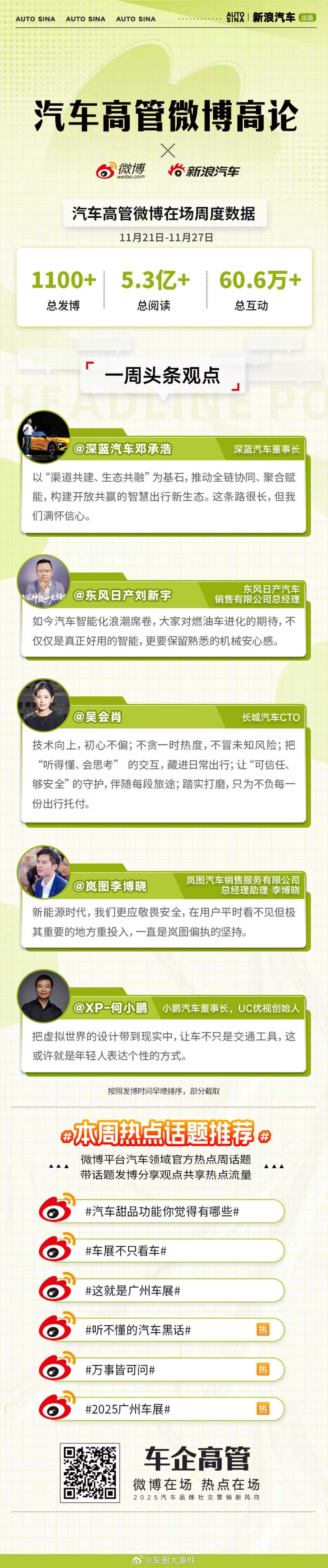 以科技赋能出行,让智能更可感、安全更可靠、个性更鲜明。汽车高管微博高论,省流速览