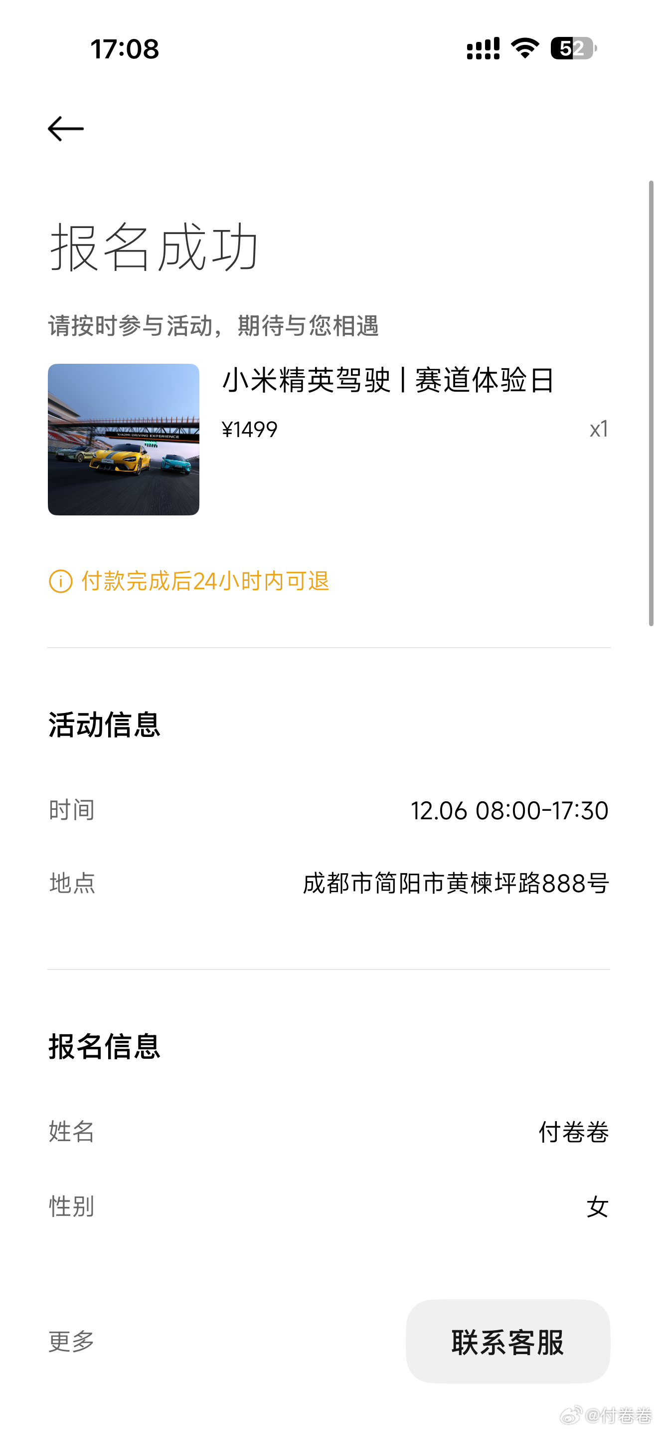 小米赛道体验日,报名成功……12月6号天府赛道见……没人跟我抢呢小米汽车付卷卷爱粟