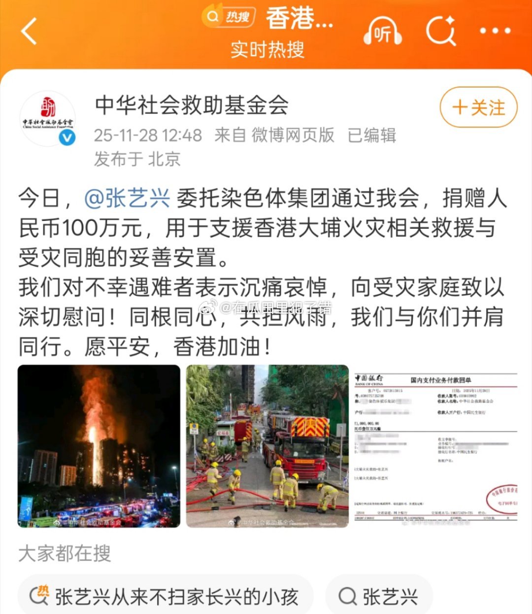 张艺兴捐款驰援香港大埔火灾救援张艺兴一直是行动>说话的