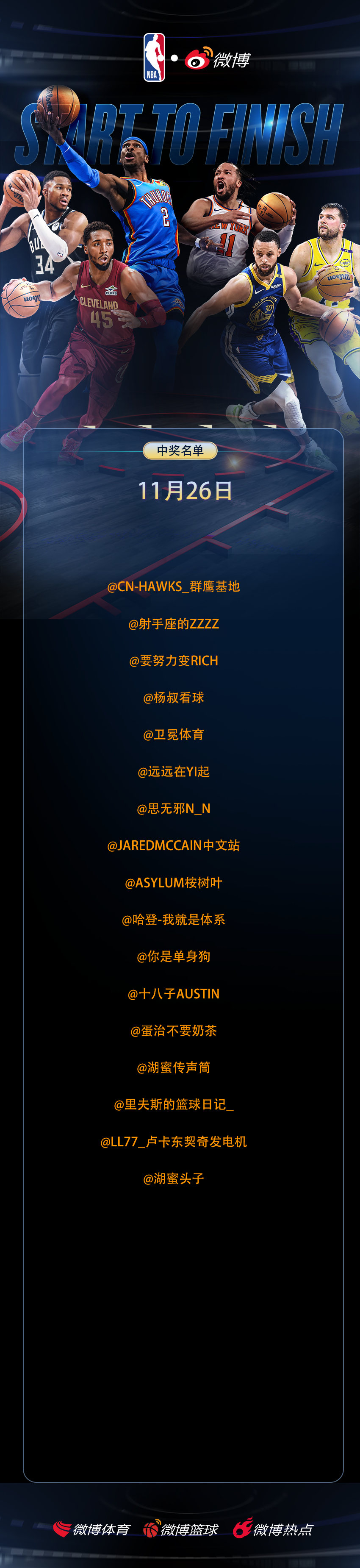 「 NBA趣评分 」11月26日中奖名单恭喜以下用户喜提6.6🧧参与球员评分,中奖率超高!一起瓜分6万元红包!参与方式:比赛日进入任意NBA球队超话,球员打分+10字评论,获得抽奖资格!NBANBA超话 活动激励将在活动结束后统一发放