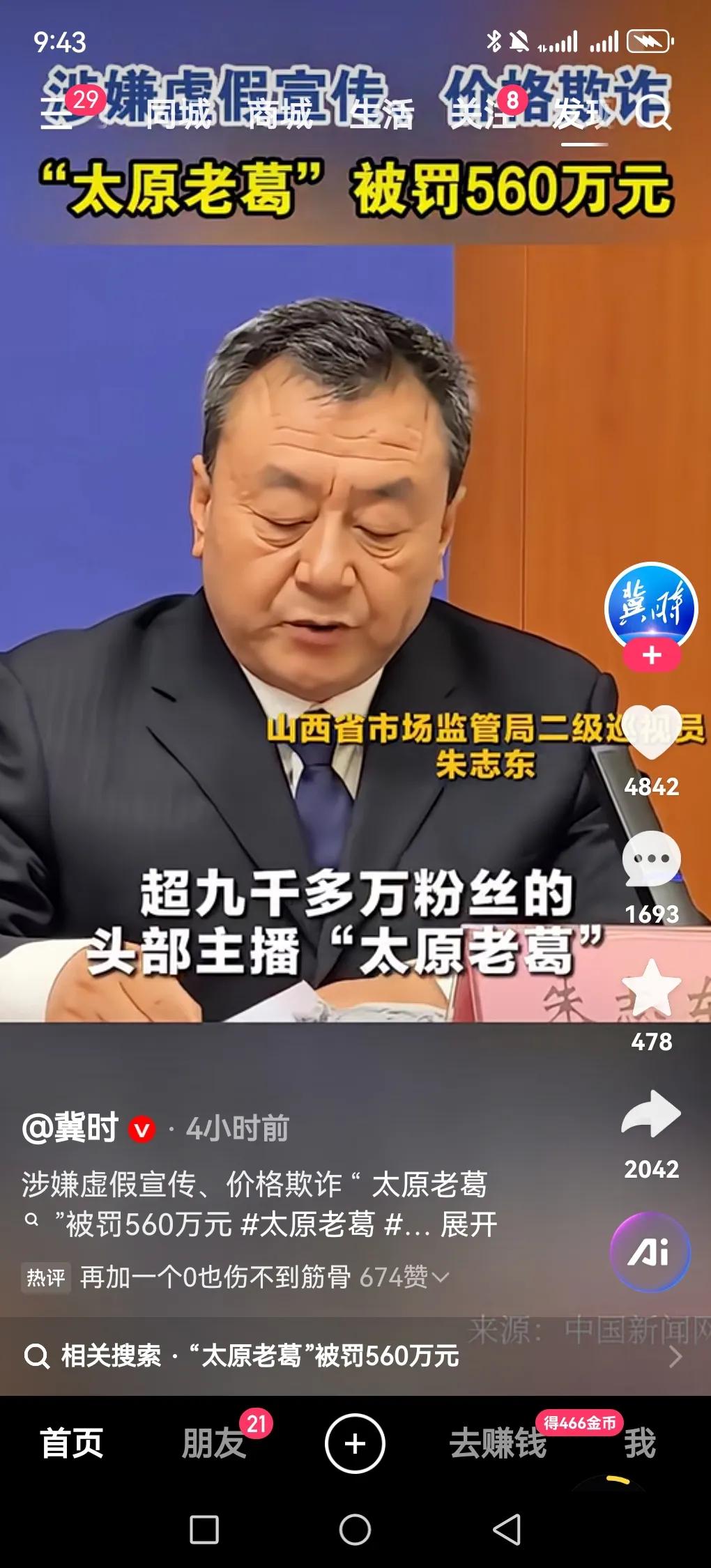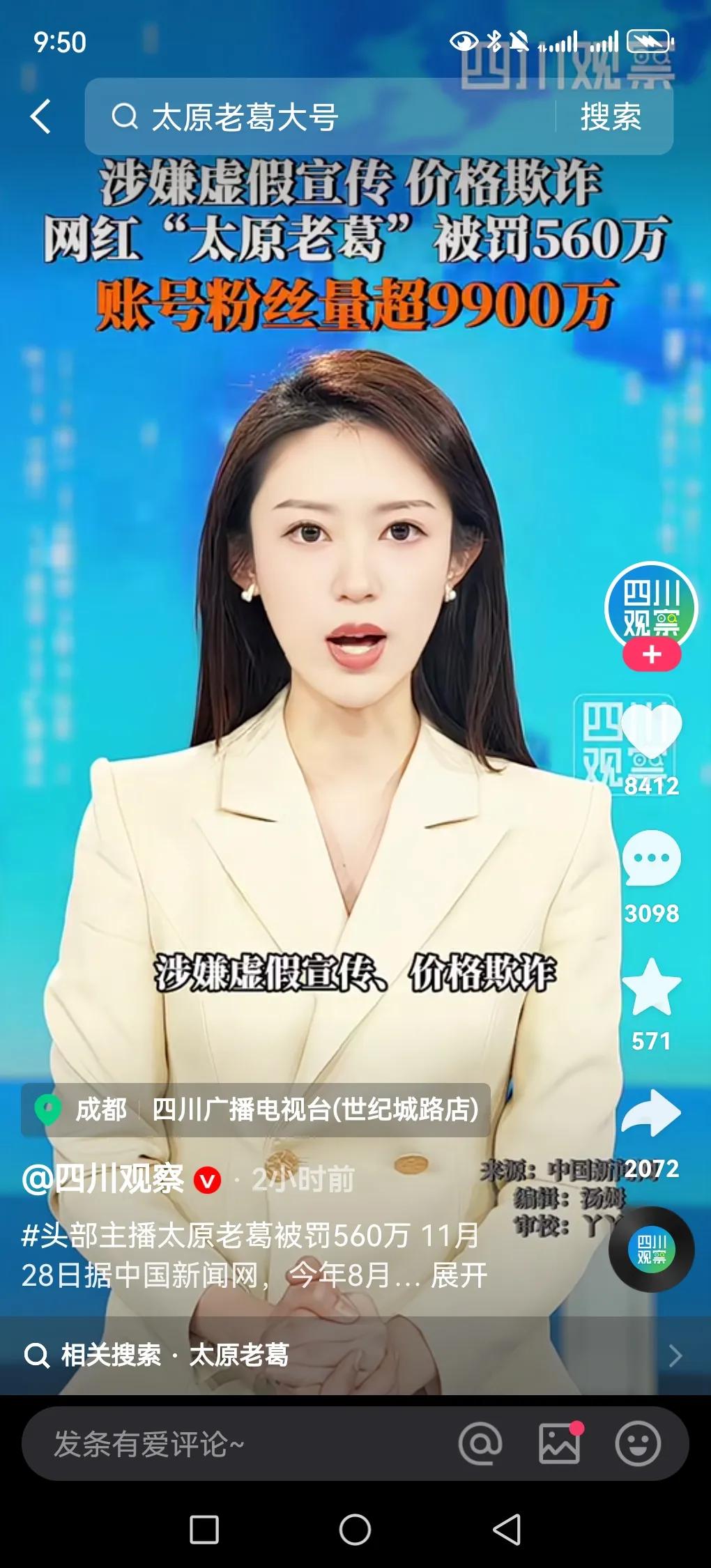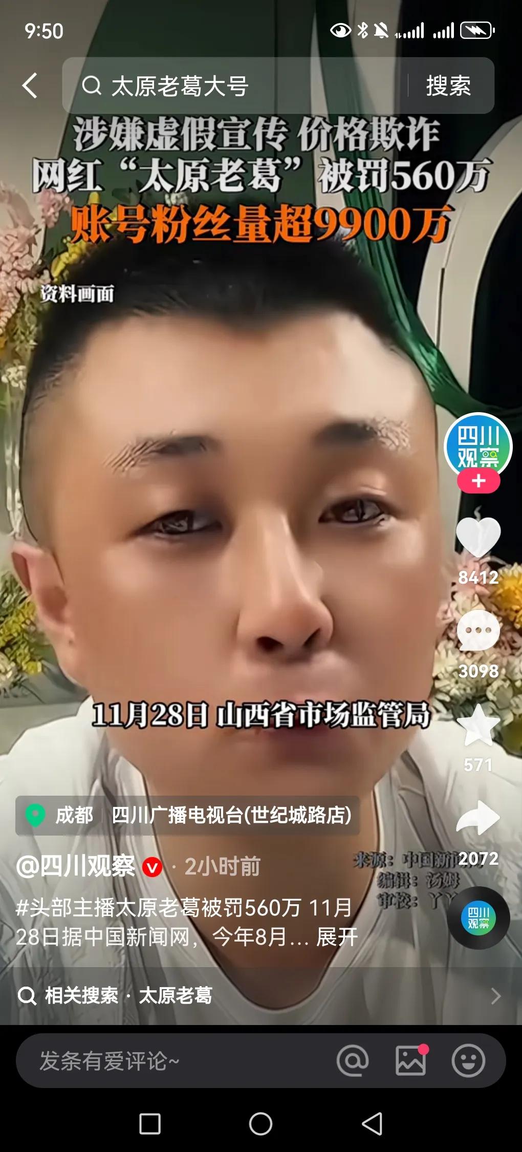 大快人心!近日,太原老葛因虚假宣传欺诈被罚,11月28日市场监管总局直播电商监管专题新闻发布会,公布了一批典型案例,超9000万粉丝的主播“太原老葛”也在其中。 经查,2023年9月到2025年3月,山西老葛商贸有限公司在直播营销超声胶原炮等30余种商品时,用无法证明或夸大的宣传语、无法证明的价格对比等诱导消费者,构成虚假宣传和价格欺诈。 2025年4月至8月,太原市及小店区市场监管局依法对其作出处罚,责令停止违法,警告并累计罚款560万。直播电商乱象不少,这次处罚给其他主播敲响了警钟。 要说太原老葛也不是一次两次了,以前亲弟弟因为帮他刷单都被抓进去踩缝纫,经常性的弄虚作假,真不知道KS平台一直让这种歪风邪气到什么时候!