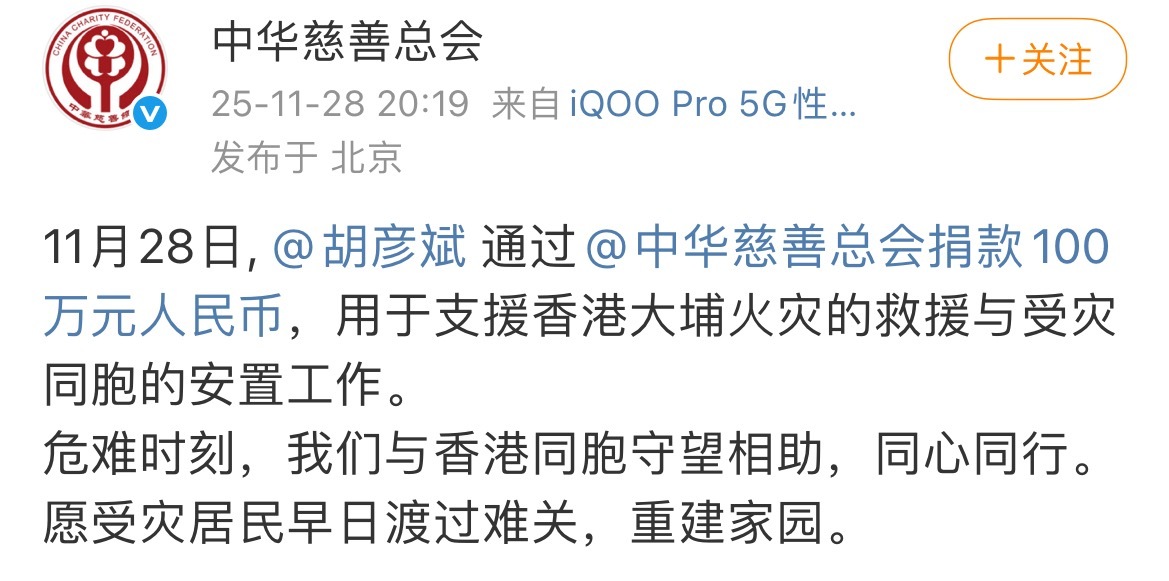 胡彦斌向香港捐款100万胡彦斌捐赠100万元音乐传情,爱心致远!胡彦斌以100万善款驰援香港,多年深耕公益从未停歇,用实际行动凝聚力量,让爱心跨越山海,温暖同行!